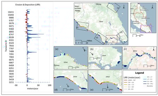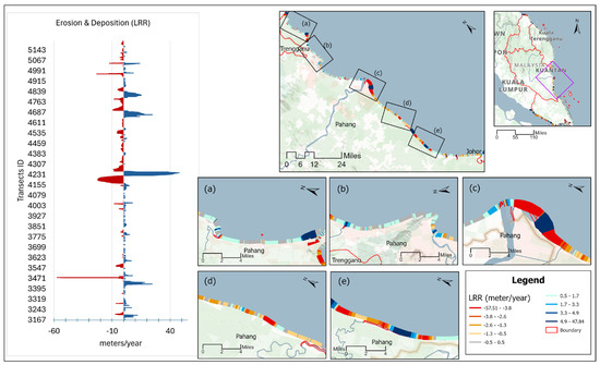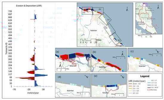Spatial distribution of shoreline change analysis in Kelantan state: LRR results.