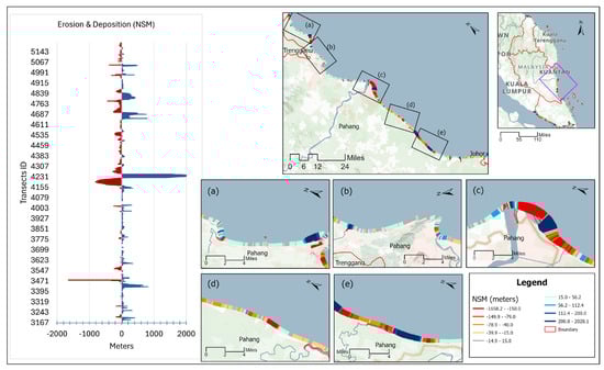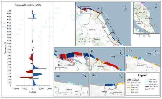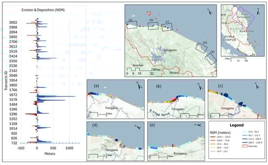 The study area covers the coastal regions of four Malaysian states: Kelantan, Terengganu, Pahang, and Johor. The overall statistics for the study area (Table 6) reveal a relatively high level of shoreline stability, with approximately 40.1% of transects showing no significant change in position. However, the coastal areas still experience substantial erosion and accretion, particularly in regions exposed to monsoon winds and strong tidal currents. The mean SCE, which measures the total horizontal displacement of the shoreline, ranges from 60 to 256.4 m, indicating different levels of shoreline variability across the study area. The maximum SCE values ranged from 2034.2 m in Kelantan to 2061 m in Pahang, highlighting areas of significant change. The NSM values provide insight into whether the coastline has been advancing or retreating over the study period. The mean NSM for erosion across the entire study area was recorded as −23.9 m (22%), while accretion was observed to be 59 m (41%), indicating that shoreline advance has been a dominant trend throughout the study area. The maximum NSM was recorded at −1885.4 m in Kelantan, reflecting the extent of shoreline retreat, while the maximum accretion was recorded at 2028.1 m in Pahang, indicating substantial shoreline growth. The LRR, which calculates the annual long-term rate of shoreline change, further corroborated these findings. The results indicated a stronger trend of accretion than erosion across most states, although significant erosion was observed in certain areas. The mean LRR values for each region reveal a general trend of shoreline advancement or retreat. The mean LRR for erosion was highest in Kelantan (−2.9 m/year), followed by Pahang (−1.24 m/year), while the positive value of LRR was found to be higher in Johor and Pahang, where accretion was more prevalent.