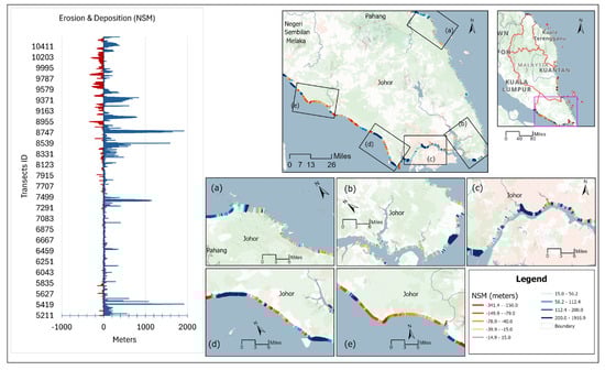 Prior to DSAS computations, preliminary processes were necessary to provide shoreline data, identify references, establish transects, and assess changes []. The predicted land–water boundaries from the most effective deep learning model (selected based on model evaluation) were converted into vector shoreline features. Each shoreline polyline was labeled with its corresponding acquisition year and georeferenced in a consistent projected coordinate system (Kertau_RSO_Malaya_Meters) to ensure spatial alignment. A common baseline was then established approximately 1 km out to the seaward and parallel to the general trend of the shoreline. This baseline served as a reference from which transects were cast perpendicularly to the coast at regular intervals []. The intervals were set at 100 m, resulting in 10,601 transects for the study area. Each transect intersects the time-stamped shoreline positions, allowing for temporal comparison. The 100 m transect spacing follows USGS DSAS v5.1 recommendations for regional-scale studies [], which state that spacing depends on the data resolution and intended analysis scale []. Given our ~30 m resolution Landsat-derived shorelines and the ~1300 km length of coastline analyzed, a spacing on the order of 102 m is appropriate to capture spatial variability without oversampling noise. This spacing has also been adopt in the recent shoreline analysis studies. For example, Jennifer Murray et al. (2023) [] used transects every 100 m to analyze ~30 km of South African shoreline. Harikrishna et al. (2024) [] similarly report casting over 800 transects at 100 m intervals to cover the Indian coastline in their study.