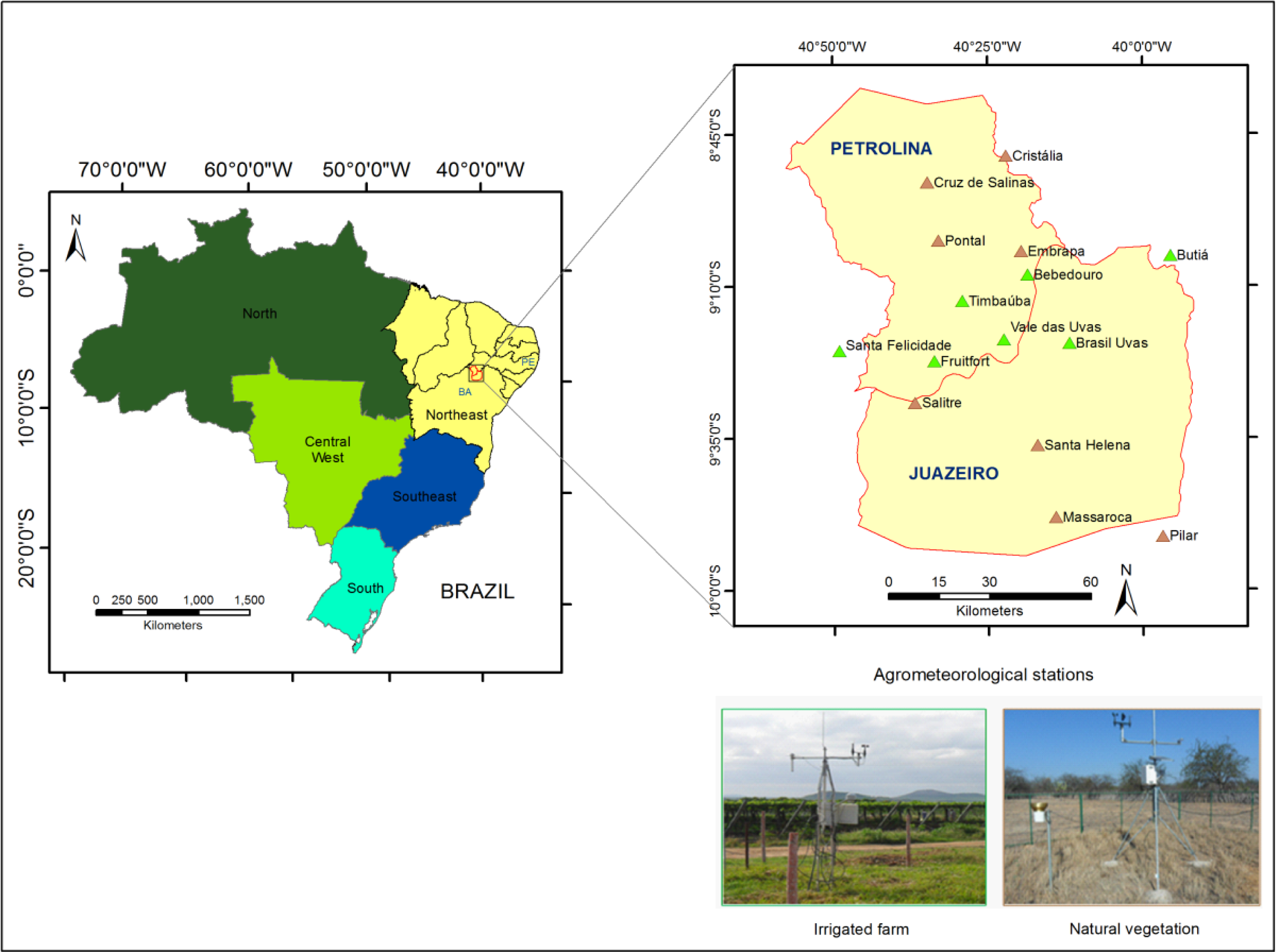 Figure 1 shows the locations of the Petrolina and Juazeiro municipalities, respectively in Pernambuco (PE) and Bahia (BA) states in the Brazilian Northeast, together with the agro-meteorological stations used for the interpolation processes inside irrigated areas and natural vegetation.