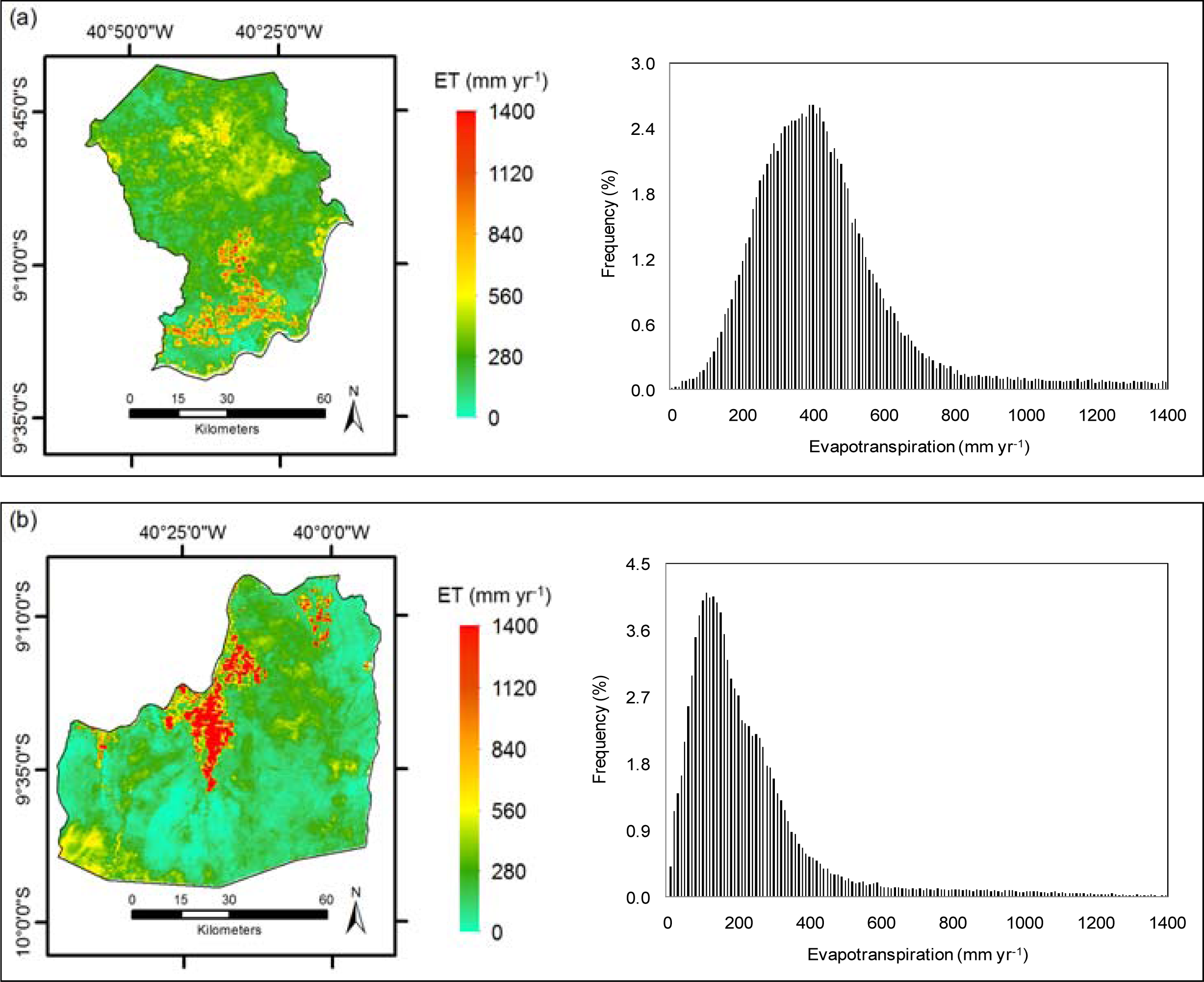 Annual values and histograms for actual evapotranspiration (ET) in the Brazilian semi-arid agricultural growing regions: (a) Petrolina Municipality, Pernambuco (PE) State; (b) Juazeiro Municipality, Bahia (BA) State.