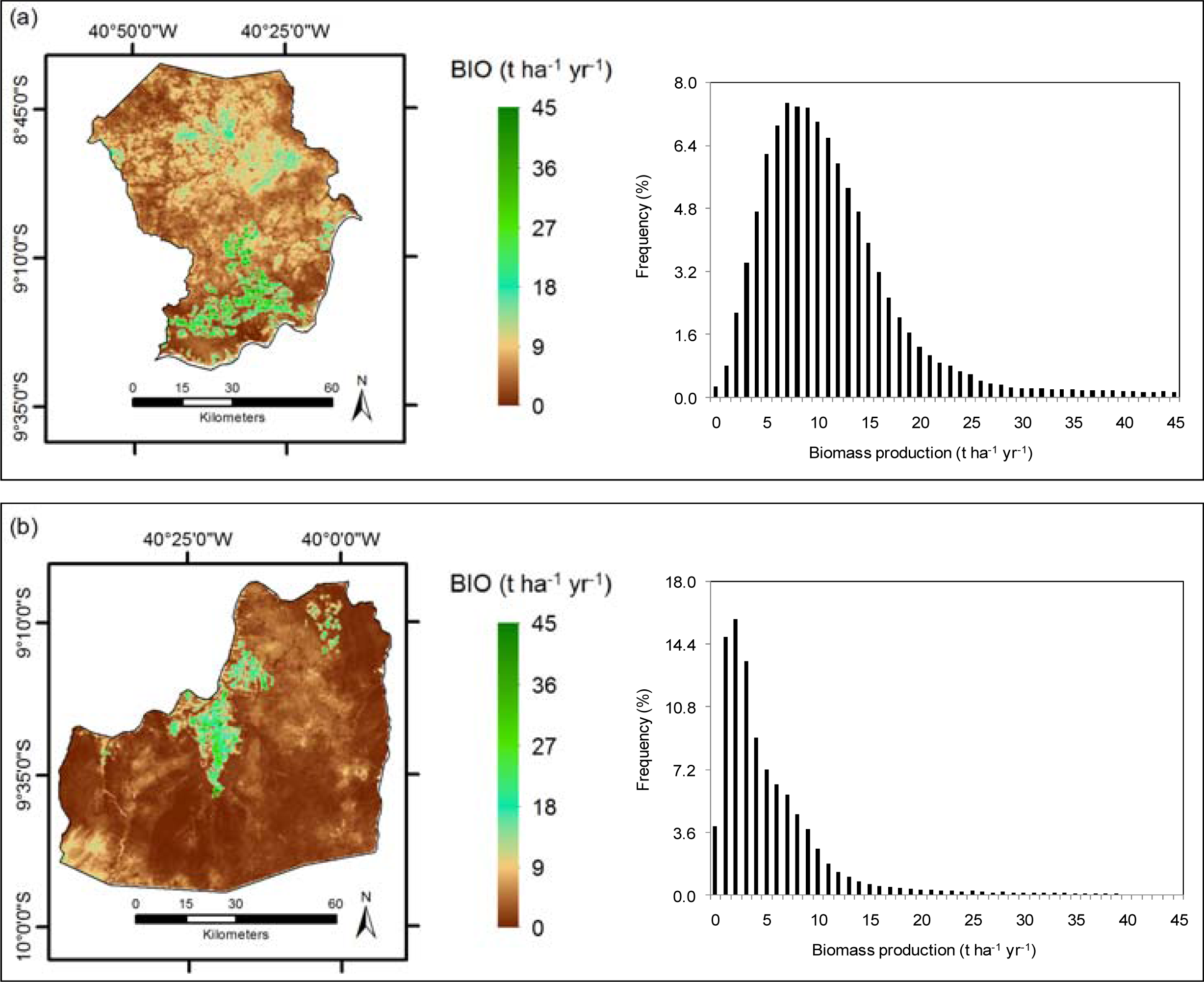 Annual values and histograms for biomass production (BIO) in the Brazilian semi-arid agricultural growing regions: (a) Petrolina municipality, Pernambuco (PE) state; (b) Juazeiro municipality, Bahia (BA) state.