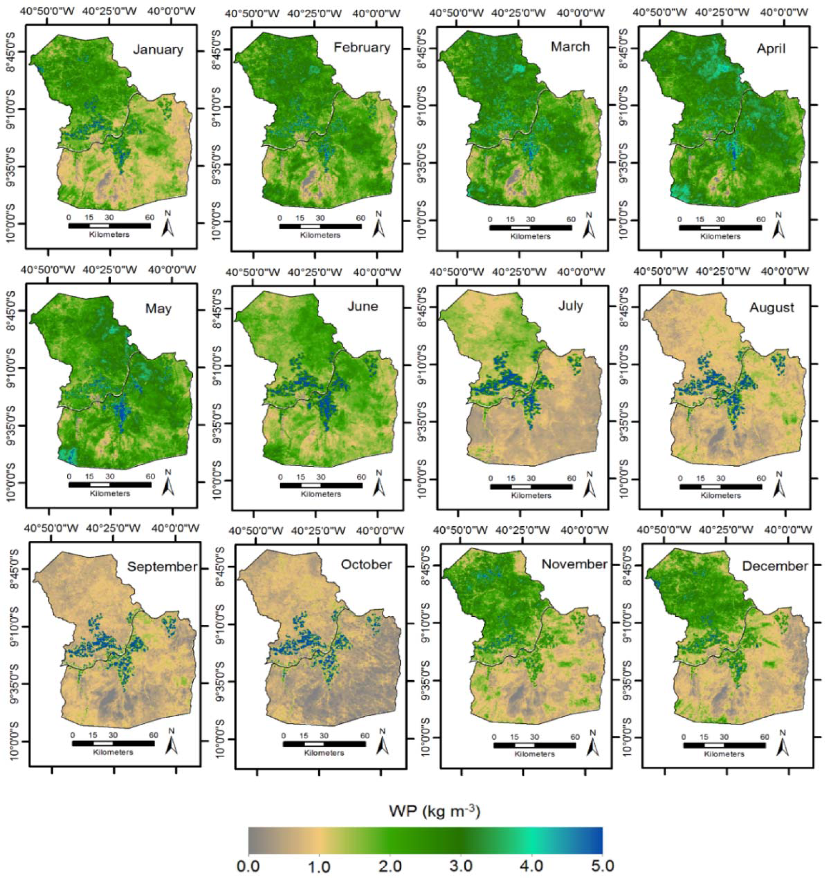 Figure 7 presents the spatial variation of the WP monthly values in the mixed Brazilian semi-arid agro-ecosystems of Petrolina (PE) and Juazeiro (BA) municipalities, respectively Pernambuco (PE) and Bahia (BA) states, along the year of 2011.