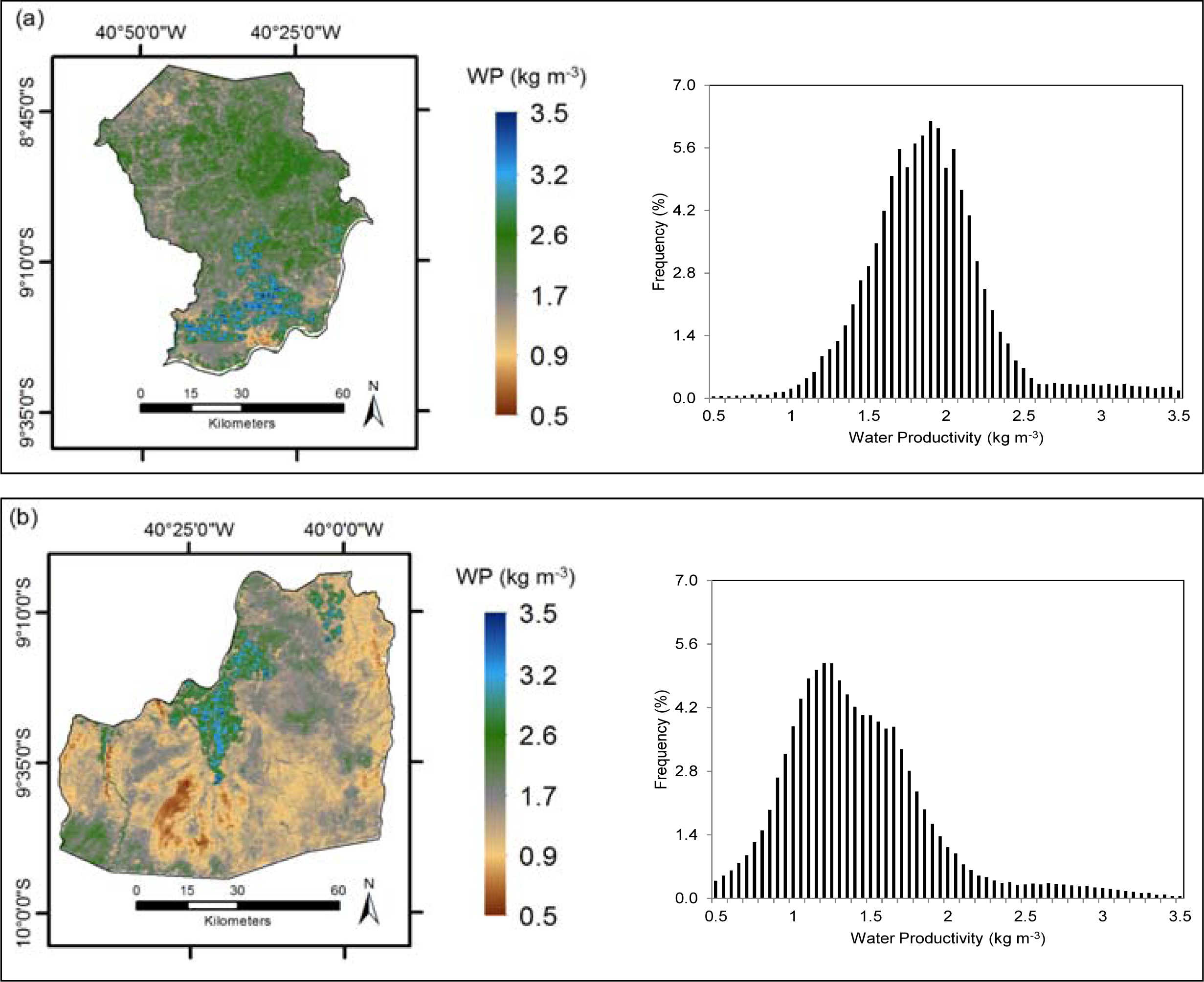 The WP annual averages for the mixture of agro-ecosystems were 1.7 and 1.4 kg·m−3, in Petrolina and Juazeiro, respectively, with the values for the second municipality representing 75% of those from the first one. In both municipalities, irrigated crops were well identified by WP above 2.5 kg·m−3, represented by the bluish pixels.The symmetric histograms from both municipalities showed that WP normalized the lower ET and BIO in Juazeiro. The most frequent WP values in Petrolina were between 1.6 and 2.2 kg·m−3 while for Juazeiro this range was from 1.0 to 1.6 kg·m−3. Although slighter than in the cases of ET and BIO, the different large-scale annual WP values between the municipalities can be mainly explained by differences in rainfall and soil water storages amounts, increasing the rainfall use efficiency by the natural vegetation in Petrolina in comparison with Juazeiro.