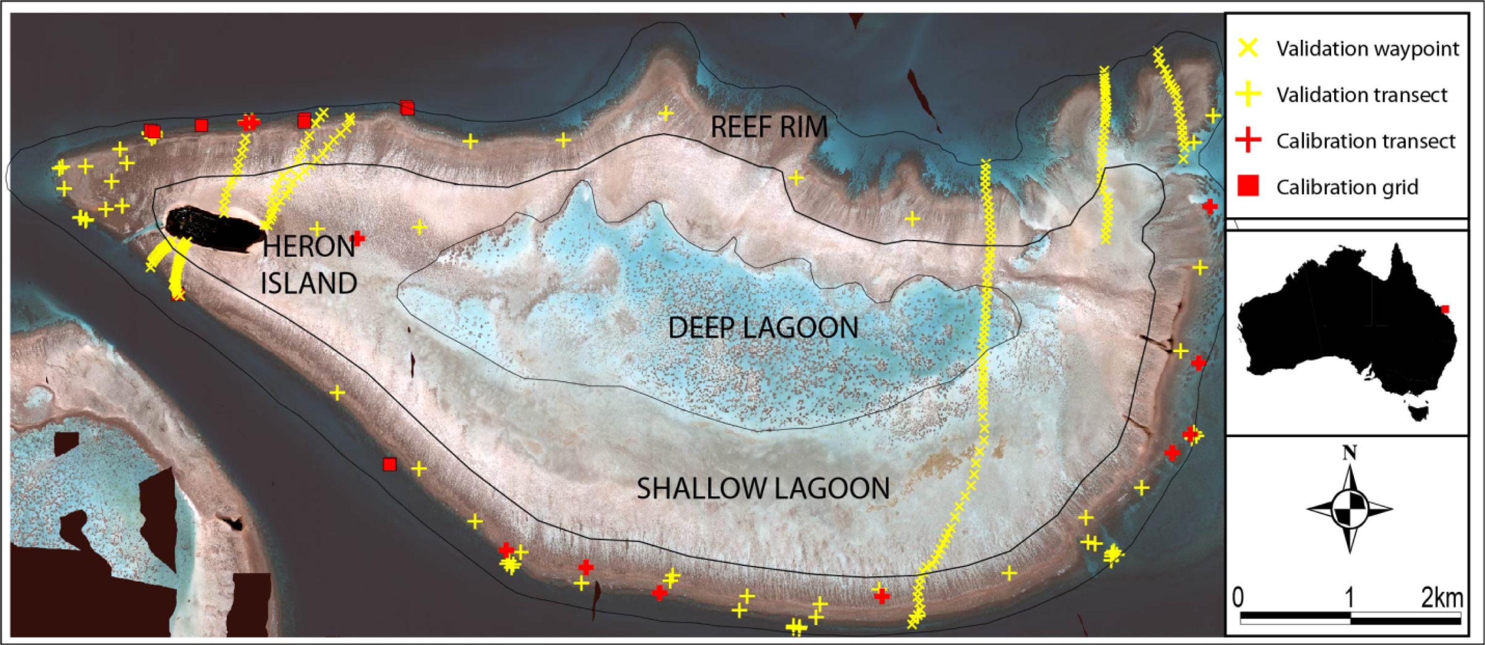 Heron Reef study site, southern Great Barrier Reef. All field data calibration (n = 22) and validation (n = 273) sites are shown. The geomorphic categories based on [37] are also outlined. “Waypoints” correspond to April 2001 field survey; “Transects” correspond to November 2002 field survey; and “Grids” correspond to May/June 2003 field survey.