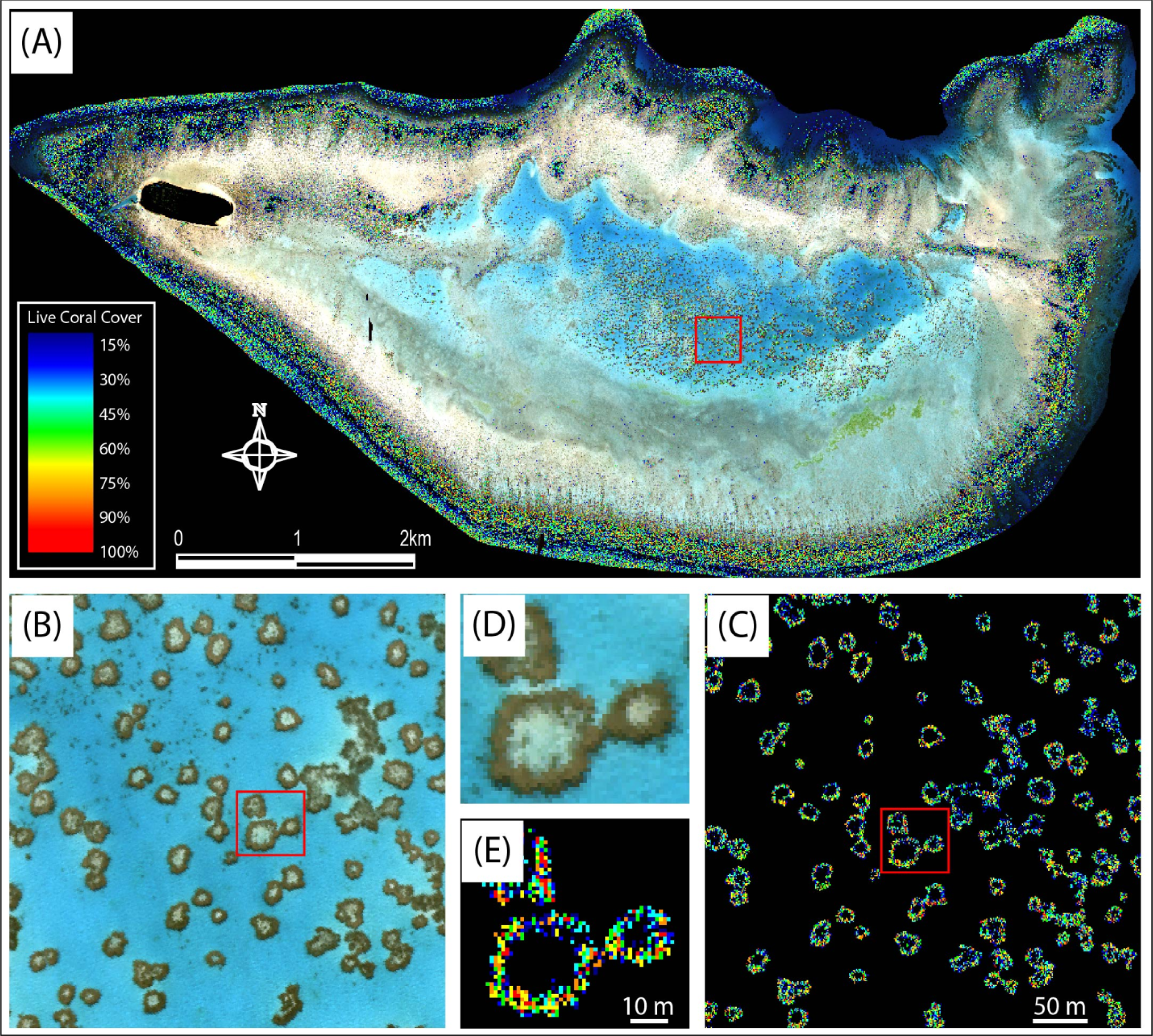 (A) Overlay of live coral cover index applied to CASI-2 image of Heron Reef; (B) CASI-2 subset from deep lagoon; (C) live coral cover index application from deep lagoon; (D) CASI-2 subset from patch reef in lagoon; and (E) live coral cover index application from patch reef in lagoon. NB: The same live coral cover scale shown in (A) is used in (C) and (E).
