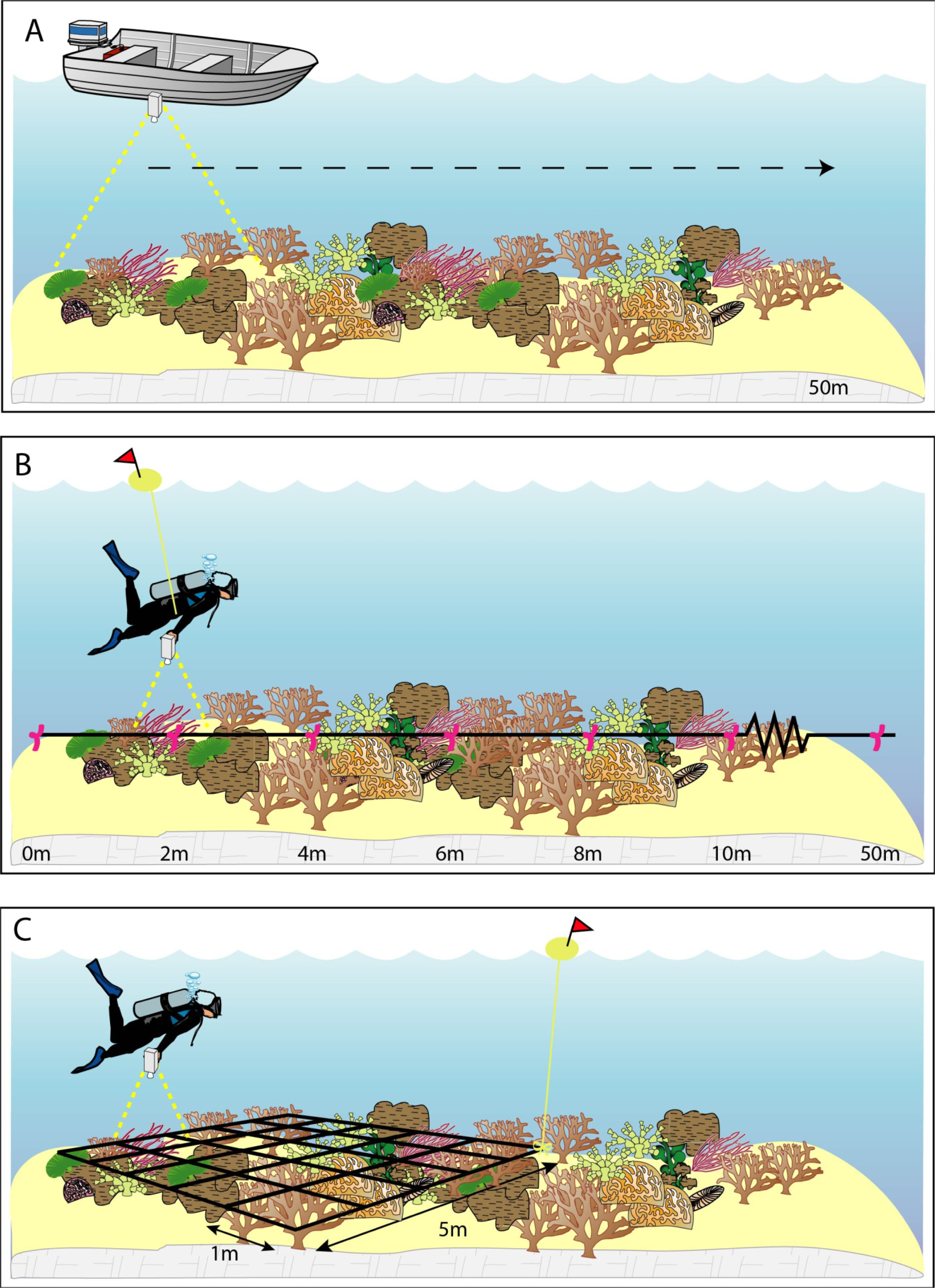 Field survey methods (A) 50 m point sampling taking two photos from a submerged camera at the side of the boat (as in April 2001); (B) 50 m transect with digital photos taken at 2 m intervals (as in November 2002); and (C) 5 × 5 m grid with digital photos taken every 1 m grid cell (as in May/June 2003).