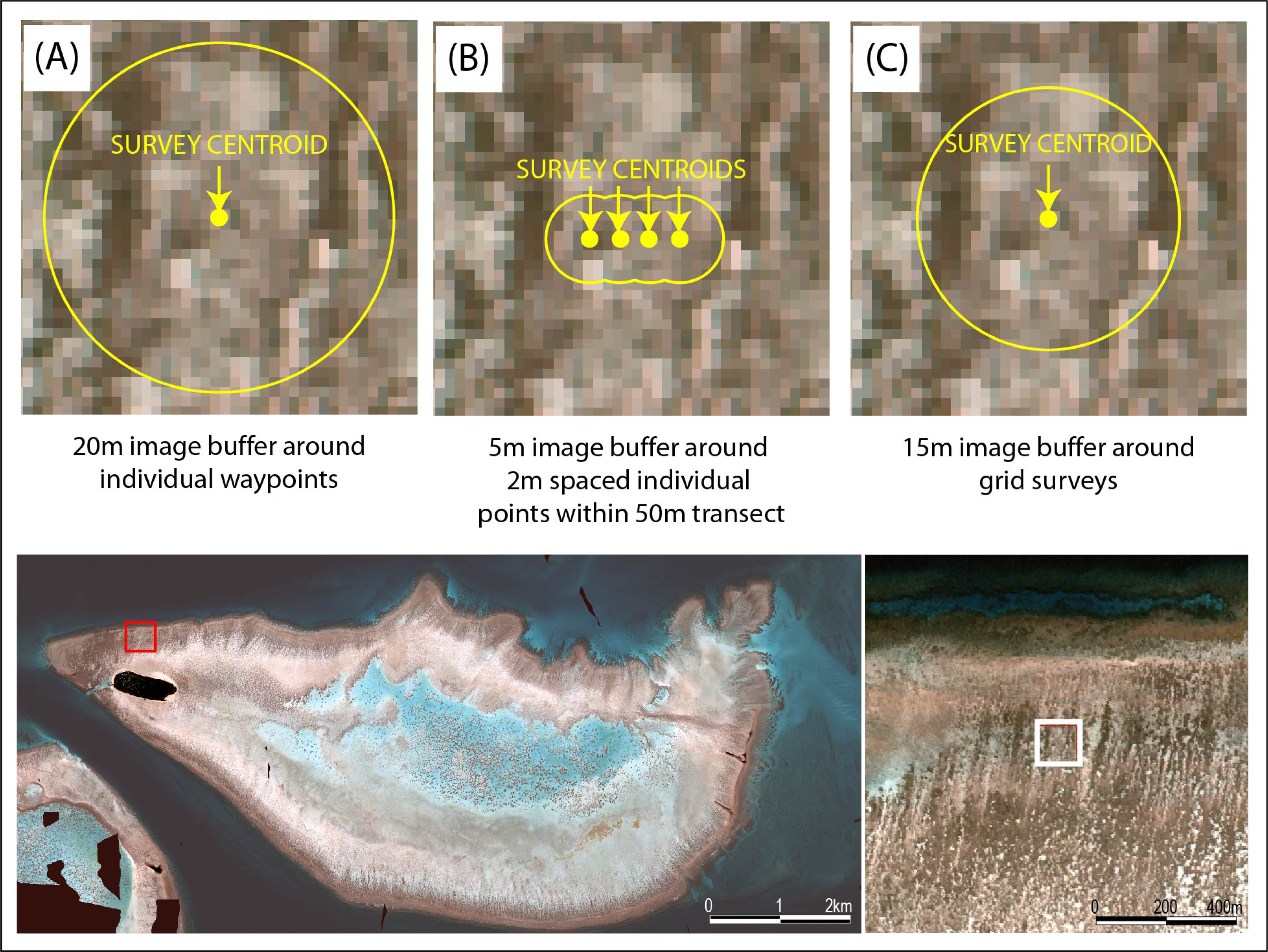 To calibrate the live coral cover index, it was necessary to establish a link between the imagery and field survey data. To do this, the GPS and benthic survey data for each field site were overlaid on the fully corrected CASI-2 image data. A circular buffer region around each field-survey data site was then determined. This included discrete points from boat based cross-reef survey, transect line from dive and snorkel transects and corner points from 5 m × 5 m grid. The resultant polygon was considered representative of the area on the ground from which the field data were sampled. The buffer distance was determined to take into account non-vertical alignment of the GPS receiver (from diver to surface), errors with geometric correction of the CASI-2 image data, and any mis-registration between field and image data. Buffer distances of 20 m, 5 m and 15 m were selected for the waypoint, transects, and grid based sample sites respectively (Figure 3). These distances were based on a qualitative estimation of location uncertainty. Where buffers around individual points within a transect (November 2002) were overlapping, these were joined to make a single polygon representative of the entire transect (Figure 3).
