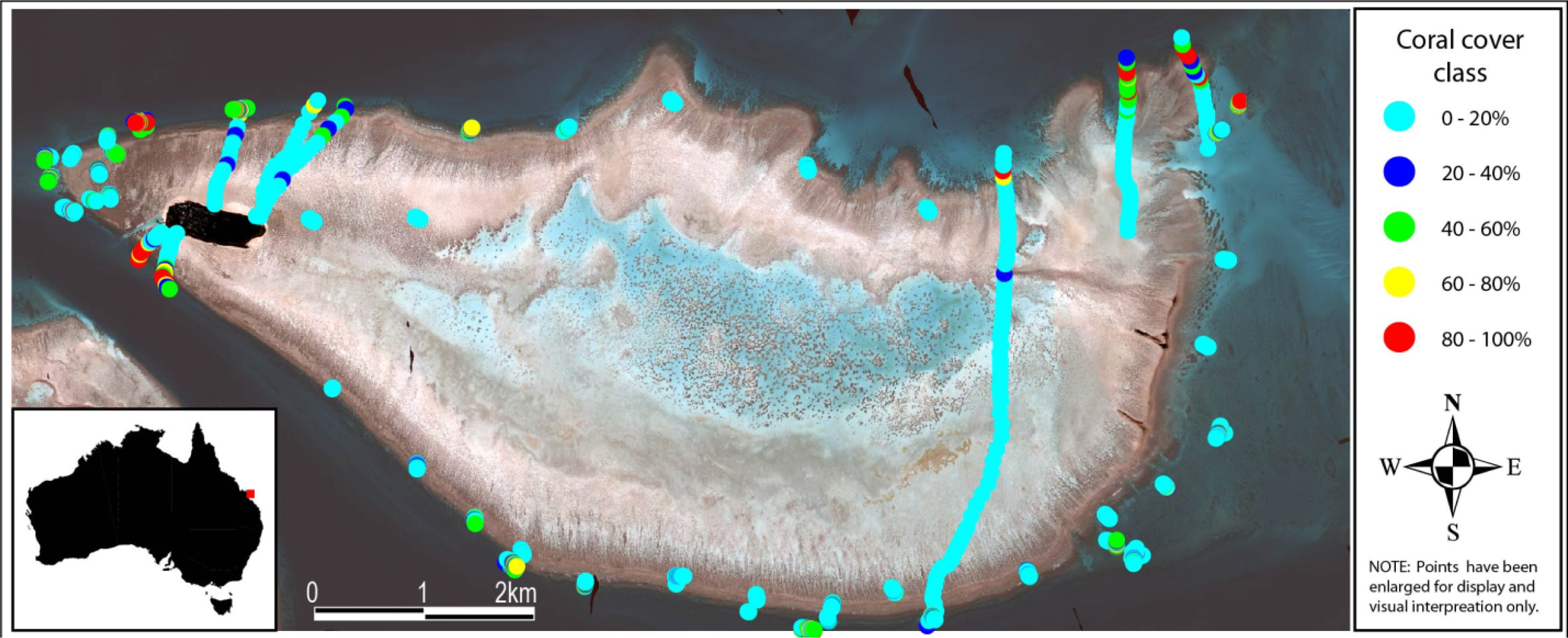 Field determined coral cover overlaid on CASI-2 image data. Each survey point has been categorized into one of the five live coral cover categories based on live coral estimation from digital photos. Note that the size of each survey point has been enlarged for visibility purposes.