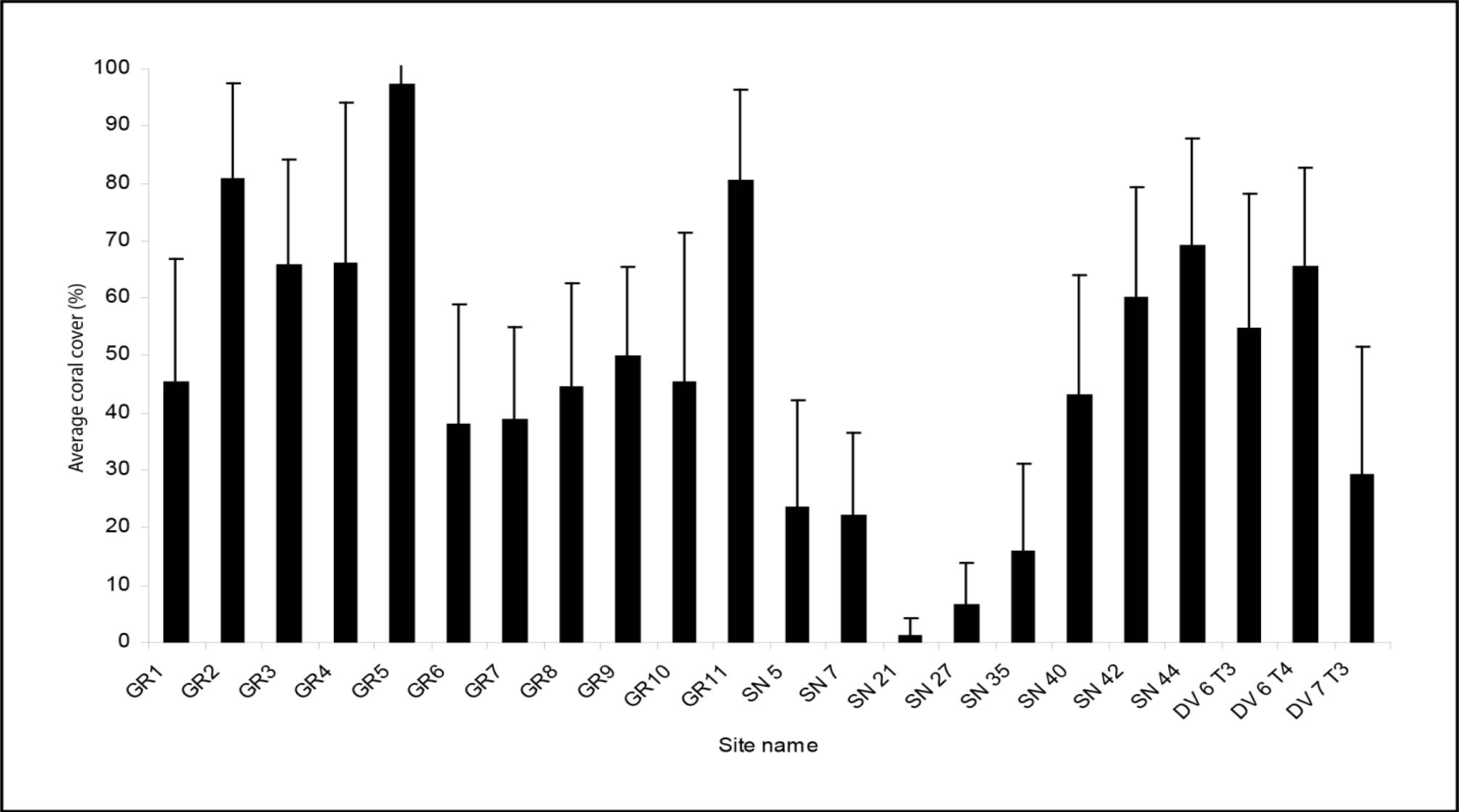 Average coral cover based on field survey of the sites used for index calibration. Bars indicate standard deviation. Site name prefixed by GR denotes a grid calibration site; SN denotes a snorkel calibration site; and DV denotes a dive transect calibration site. See Figure 1 for location of grid, snorkel and dive transect calibration sites.