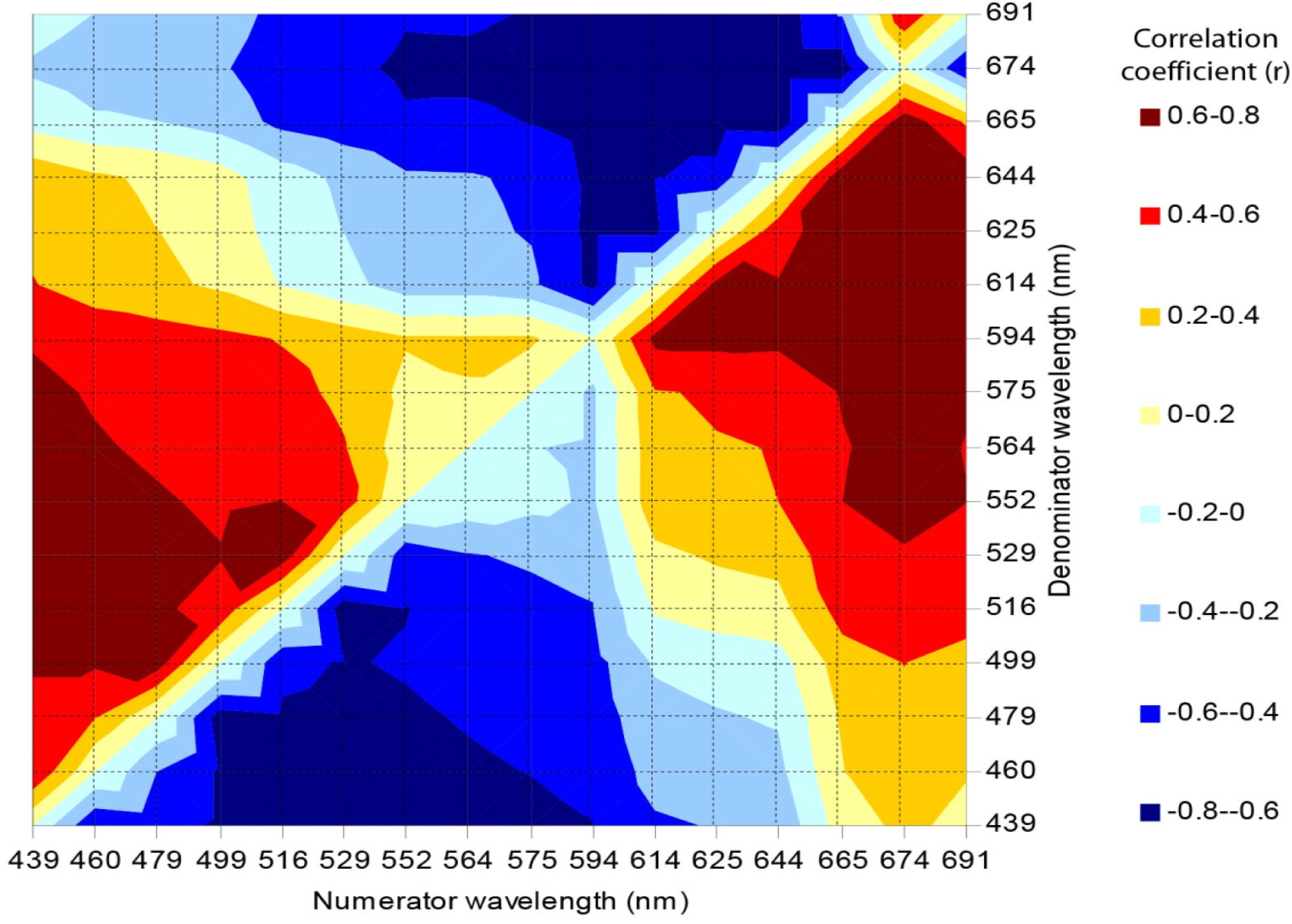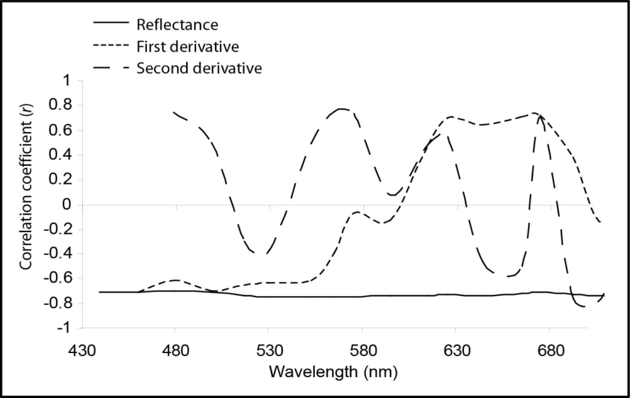 Correlogram of linear correlation coefficients between live coral cover and spectral reflectance, first derivative and second derivative.