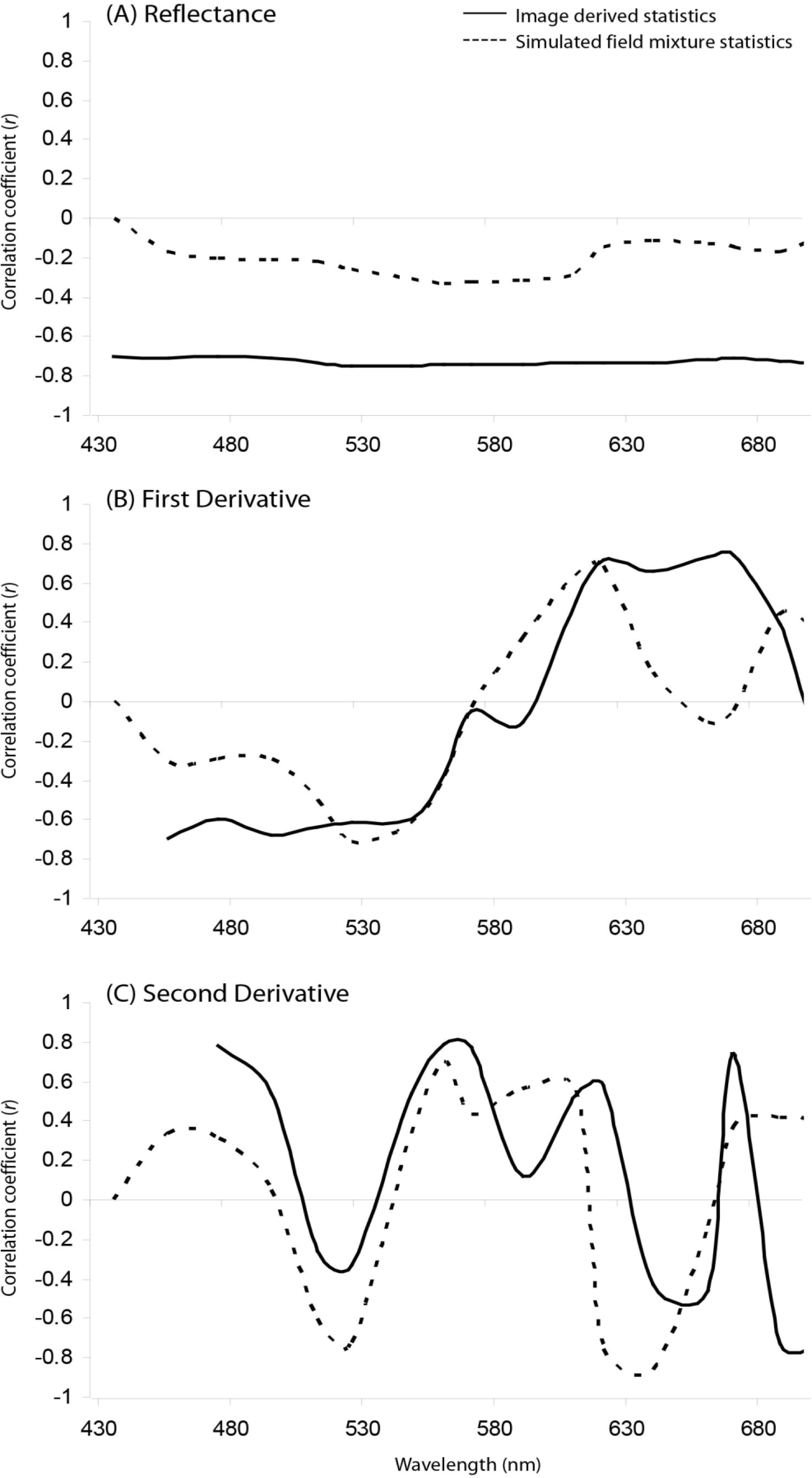 Comparison of field spectrometer simulations with applied CASI-2 image data-linear correlations for relationship between live coral and (A) reflectance; (B) first derivative; and (C) second derivative.