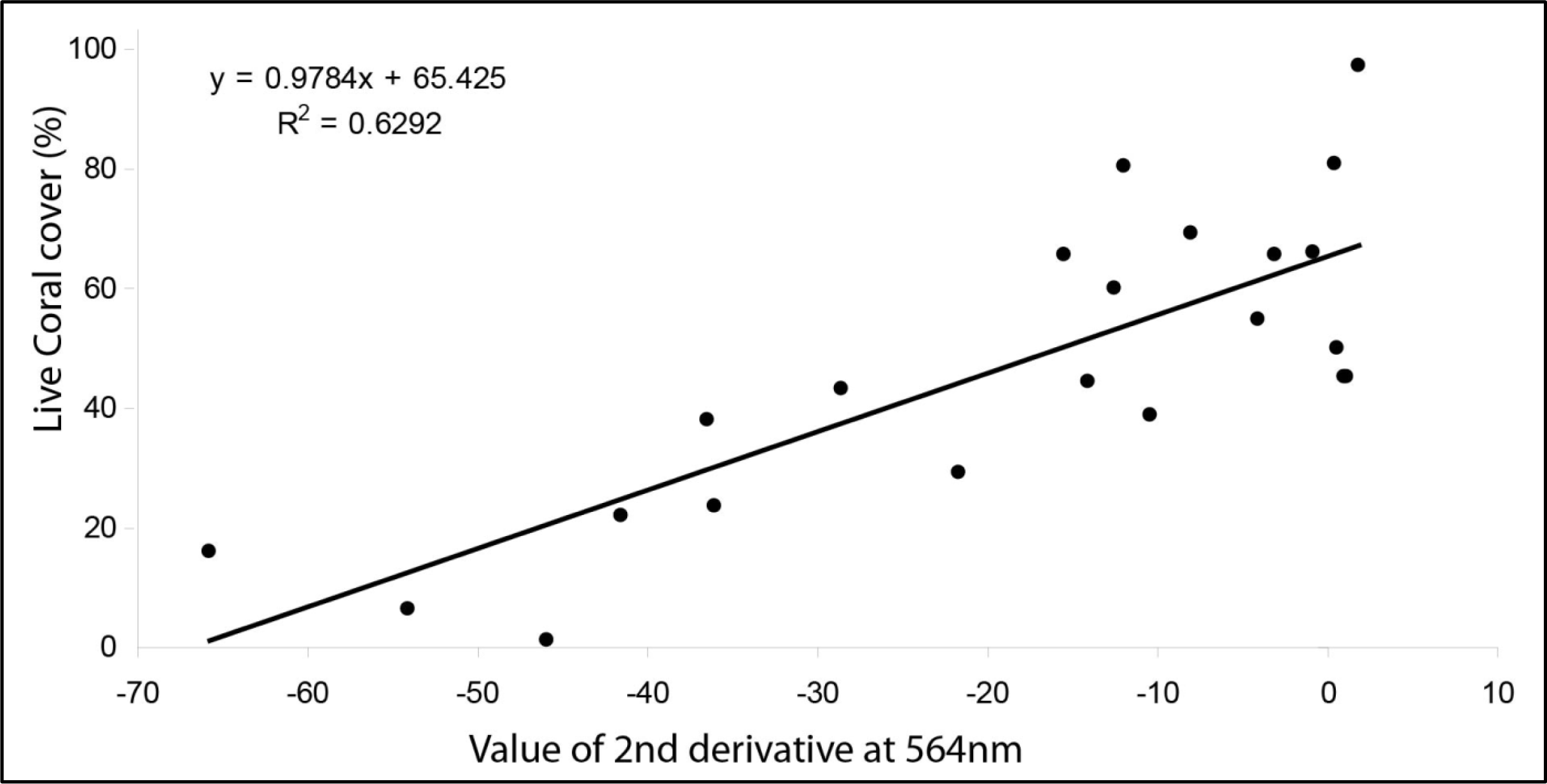 Linear correlation equation determination between live coral cover and 2nd derivative around 564 nm.