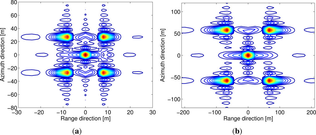 To evaluate the performance of the derived imaging algorithm, four example BiSAR data for five point targets are simulated using the parameters listed in Table 1 and the pulsed repeated frequency (PRF) and pulse duration listed in Table 2. A distance separation of five times of the range/azimuth resolution is assumed in the simulation examples. Additionally, the instantaneous squint angles of the transmitter and receiver at their zero-Doppler frequencies are supposed to be ζt0(τ = 0) = 0 and ζr0(τ = 0) = 0. After being processed by the proposed image formation algorithm, the results are given in Figure 8. Note that there is a small image shift between Cases A and C, but it is difficult to be observed with the unaided eye because they have only a small difference in the receiver’s velocity. As the reference range used in the imaging algorithm is chosen to be the central target range, it can be noticed that the imaging performance of the central target is better than the edge target. From the results we conclude that the five point targets are well focused and the imaging performance is acceptable. For large scenes, we can divide the entire scene into sub-scenes characterized by different reference ranges.