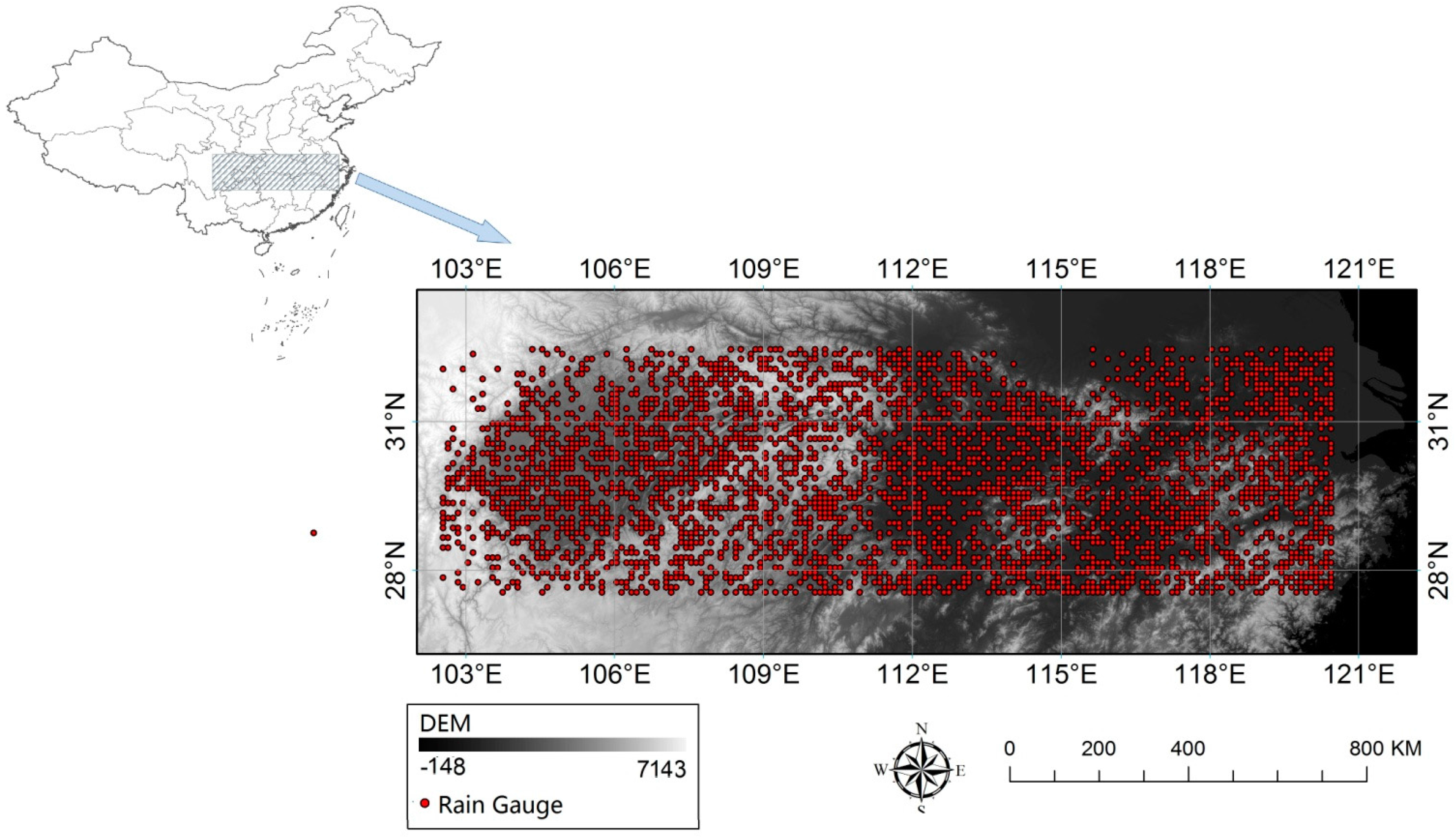 The actual precipitation used in this study is the hourly precipitation measured by 3045 rain gauges over the Yangtze River Basin. These rain gauges measured the precipitation with an intensity above 0.1 mm/h at their locations. The measured precipitation datasets were processed and administrated by the China Meteorological Administration (CMA). The spatial distribution of these rain gauges is presented as red points in Figure 1. The dense rain gauge network over the study area could effectively capture the rainfall event over this area and provide sufficient samples to establish and validate rain area delineation methods.