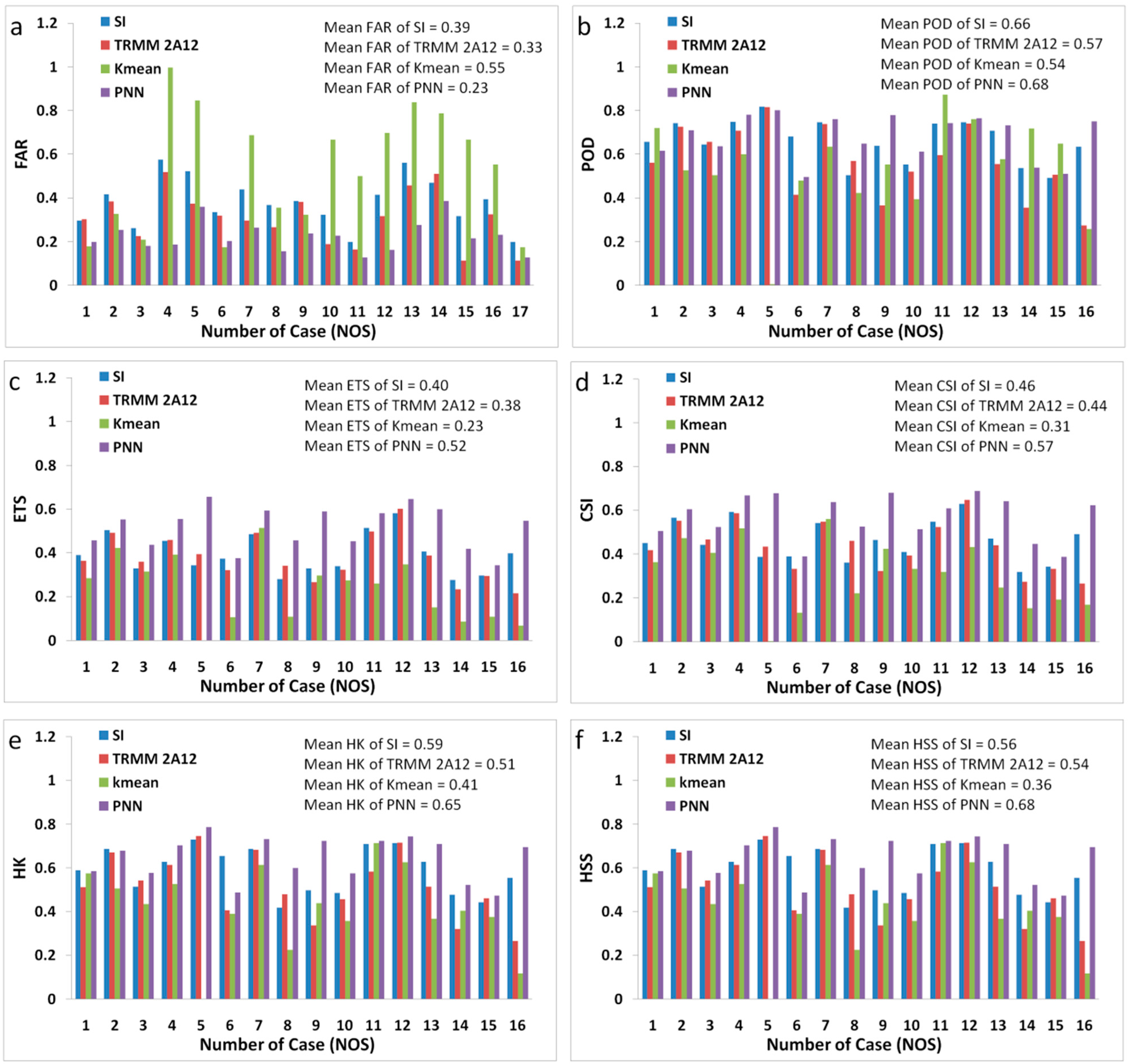 The results of (a) false alarm ratio (FAR), (b) probability of detection (POD), (c) equitable threat score (ETS), (d) critical success index (CSI); (e) Hanssen and Kuiper discriminant (HK) and (f) Heidke skill score (HSS) of the rain area delineated by the threshold method of Scatter Index (SI_threshold), probabilistic neural network (PNN), TRMM Microwave Imager (TMI) Level 2 Hydrometeor Profile Product (TRMM 2A12) and dynamic cluster K-means (Kmean) methods.