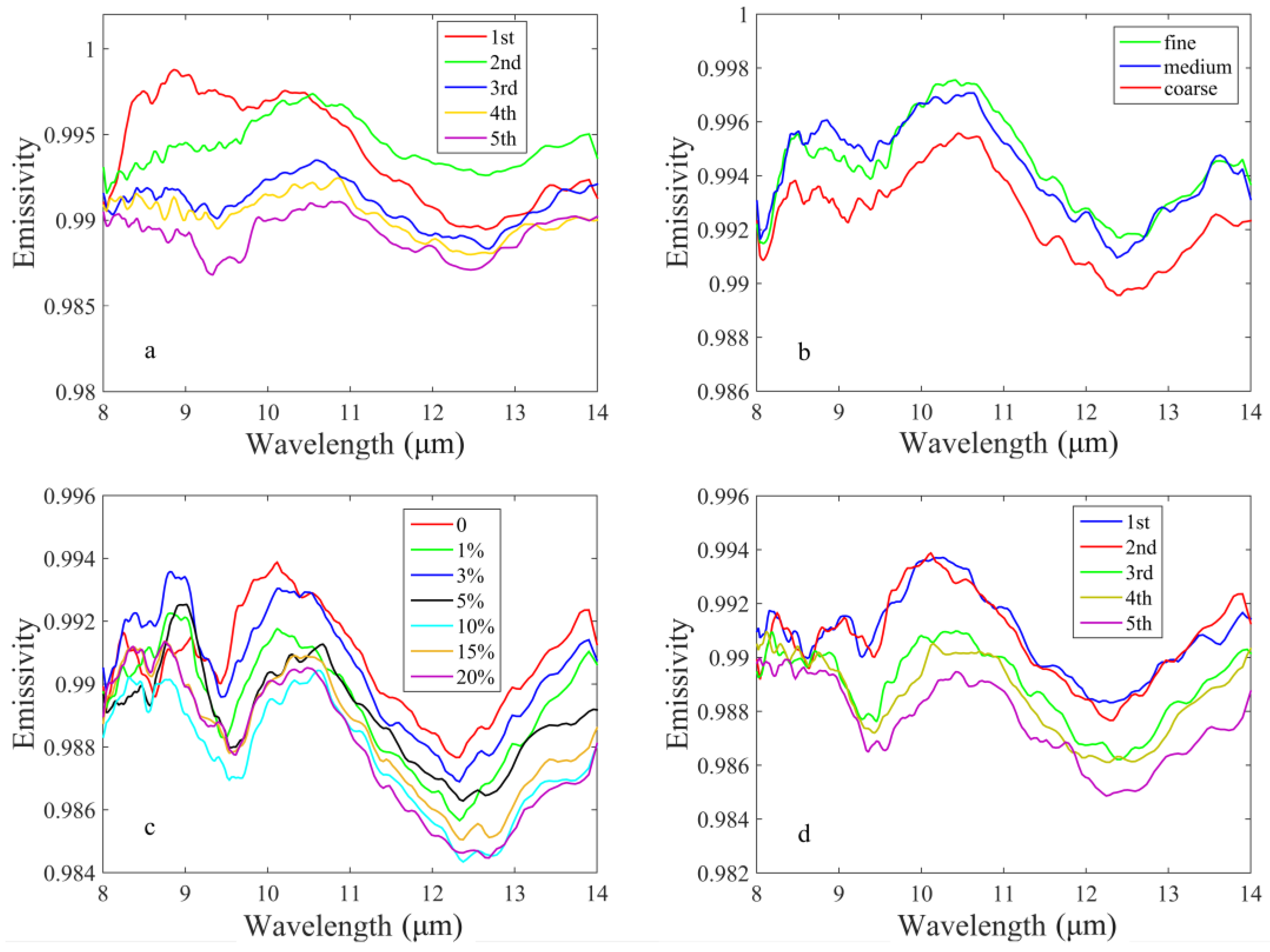 Spectral characteristic of the various sample settings: (a) emissivity of various soil water contents for medium soil particle size (0.2–2 mm); (b) emissivity of different soil particle size for the third measurement; (c) emissivity of various soil salt levels at the second measurement; and (d) emissivity of various soil water contents for the sandy soil without salt added. Note: 1st, 2nd, 3rd, 4th and 5th represent the times measured soil water content and emission. Fine, medium and coarse means the different soil particles.