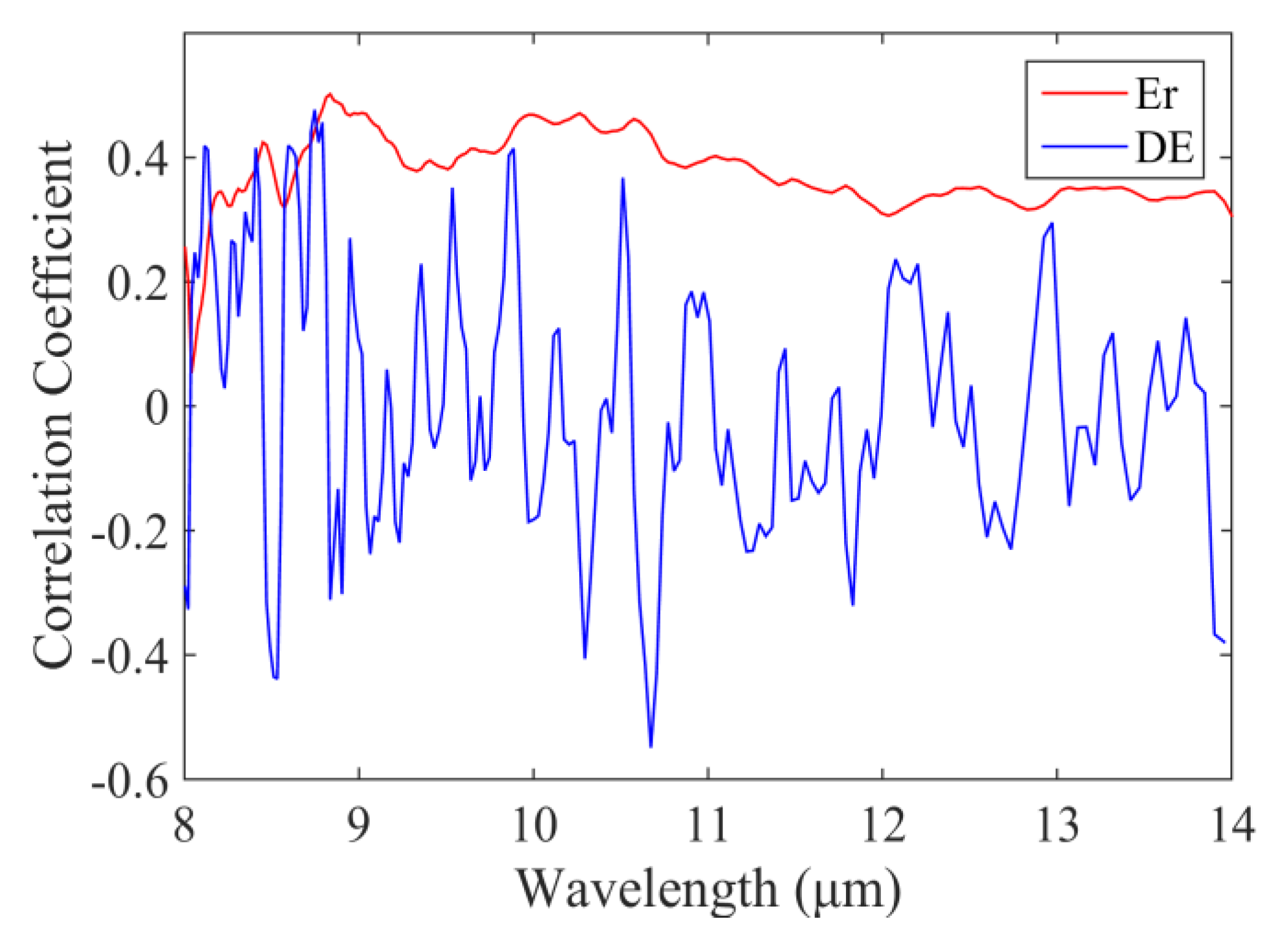 Relative emissivity (denoted as Er in this study), which has been further normalized with the emitted radiance at 7–7.5 μm (a domain with emissivity approximated to 1), has been applied in this study in order to eliminate further measuring noises.