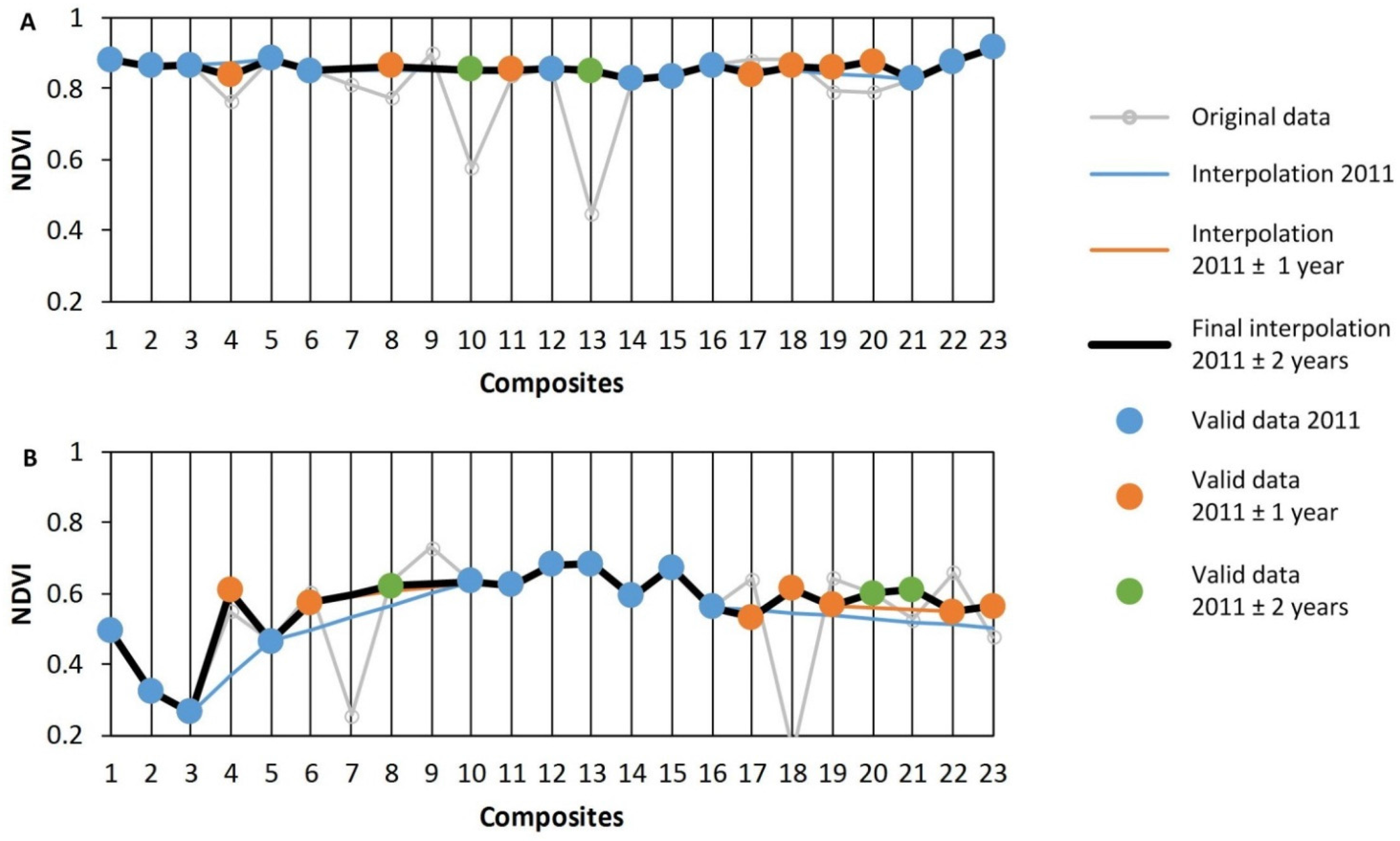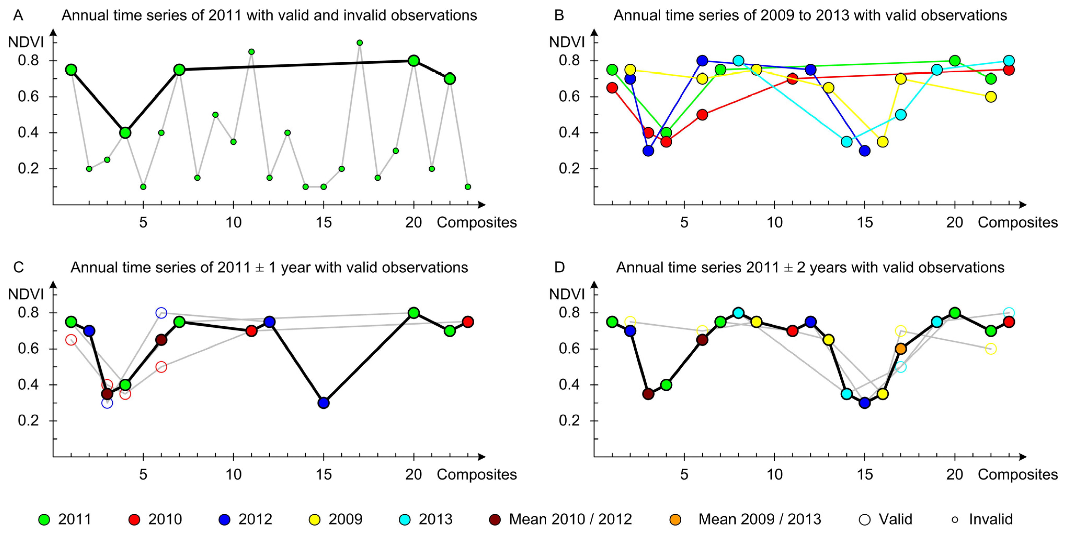 Figure 1 illustrates the time series generation approach by integrating multi-year data to generate an annual time series as proposed in this study. It employs hypothetical NDVI data to describe a bi-modal curve, e.g., typical for bi-seasonal dryland agriculture in inner-tropical regions. Figure 1A shows an annual time series for 2011 (Yn), where the grey line, joining small and large circles, indicates the annual time series without data quality analysis and the black line, connecting only large circles of valid observations, the linear temporal interpolation of all valid observations. The latter resembles the common time series generation approach by inferring invalid observations from previous and posterior valid samples as implemented in most time series generation packages. Note that the longest data gap is 13 composites (the compositing length is 16 days) which corresponds to more than half-a-year. Figure 1B shows five annual time series (different colors) with circles indicating the valid observations and lines for the linear temporal interpolation. Neither time series resembles the expected bimodal temporal profile.