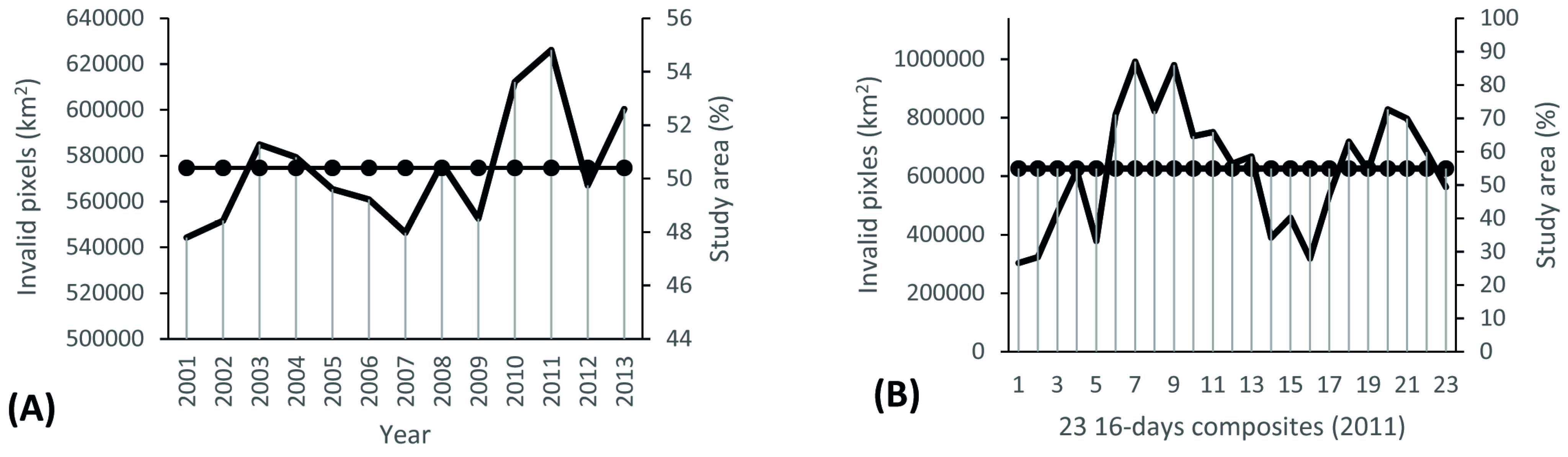 Climate and topography defined the spatial and temporal distribution of invalid pixels. The statistics of invalid pixels from 2001 to 2013 (n = 13) ranged from a minimum of 544,211 km2 (47.7%) in 2001 to a maximum of 626,218 km2 (54.9%) in 2011 (Figure 2A) with an average area of 574,457 km2(50.4%). For a single year (2011 in Figure 2B) there is a bimodal distribution of invalid pixels. This temporal pattern is valid for most parts of the country and follows the annual shifts of the low-pressure belt of the intertropical convergence zone (ITCZ) with two rainy seasons intercalated by dry and semi-dry periods.
