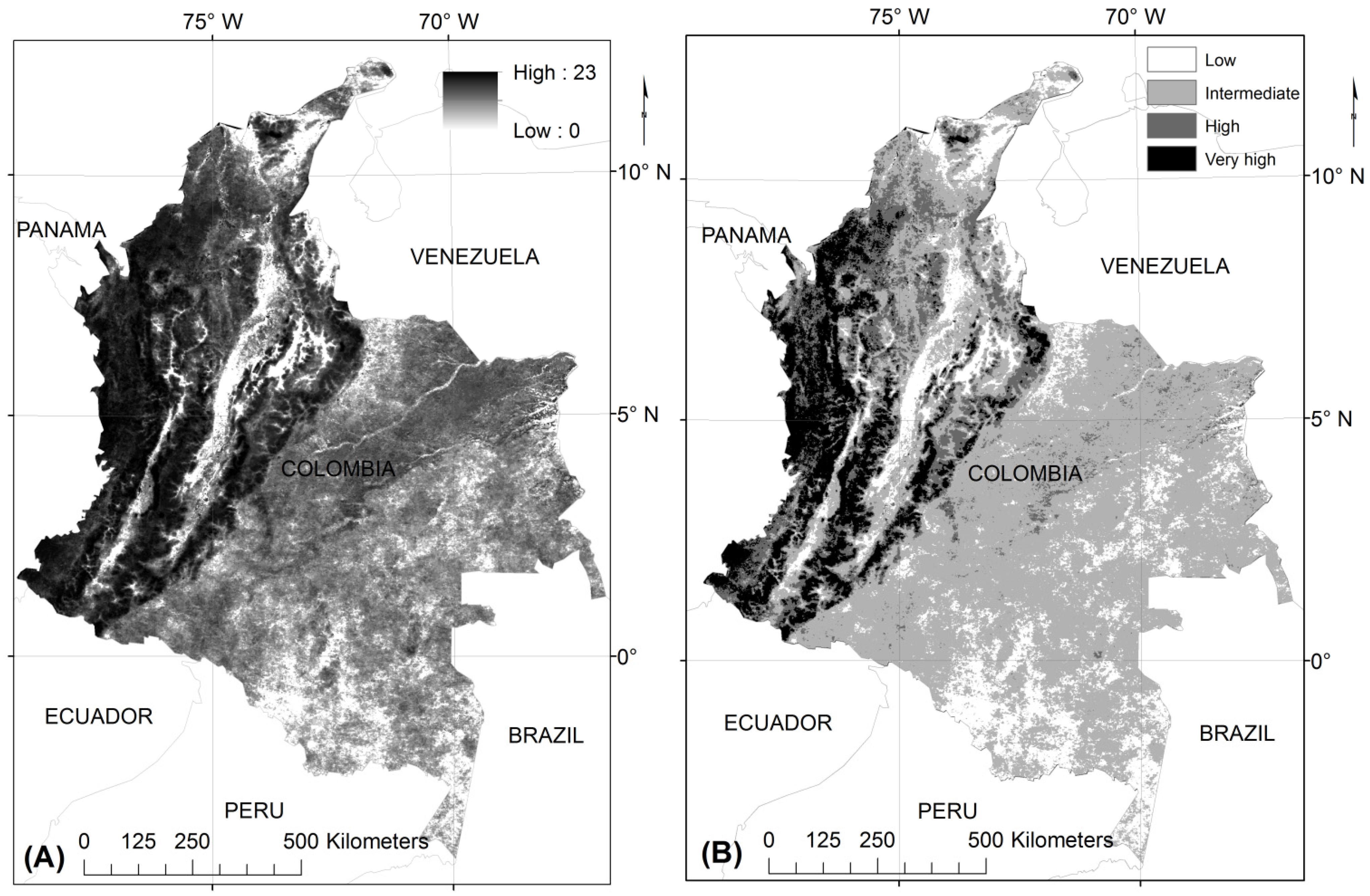 The continental extension of Colombia is 1,141,748 km2. The national territory is located in the neotropics, ranging from the Caribbean Sea (12° North) to the northern Amazon basin (4° South) and from the Orinoco river (67° West) to the Pacific Ocean (79° West). The country is commonly divided in five regions: Caribbean, dominated by grasslands, wetlands and bare soils; Pacific, made up of pluvial and very humid rain forest; Orinoco, dominated by savannas in a flat landscape; the rain forest area of the Amazon; and the Andes mountains, with highly modified natural ecosystems, an important crop extension, road networks, and built-up areas. Important activities promoting land use and change in Colombia are related to illegal cropping [36], mining, agriculture, and deforestation [37]. The main climate controls of this region with abrupt topography are: the Inter-tropical Convergence Zone (ITZC), the two low-level jet streams (Chocó and San Andrés), the feedback of the Amazon evapotranspiration, and the El Niño-Southern Oscillation (ENSO) [38]. The topographic effect is important since approximately one third of the country (392,380 km2) is covered by mountains. This includes Chocó-Darién moist forests, Northern Andean Montane Forests, and Santa Marta Montane Forests [39].