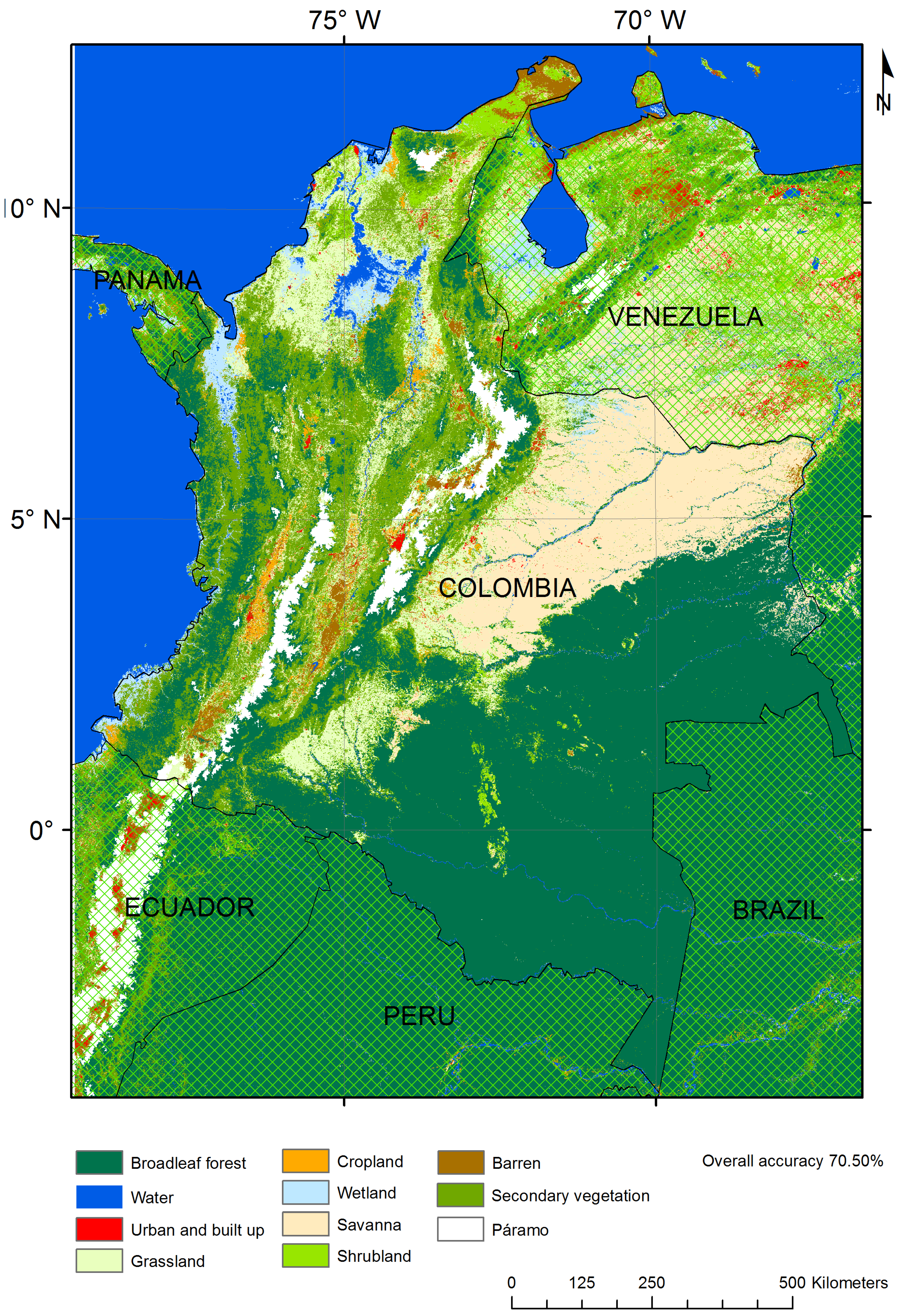 Several other aspects may be considered to improve this result: training data may include mixed pixels to improve the classification of fragmented landscapes. A temporal match between reference data (to train and validate) and satellite data is desirable but difficult to achieve, as they are expensive to obtain and depend on specific sources or surveys. Some classes, such as páramo and secondary vegetation are defined from an ecosystem perspective and, thus, do not strictly link to land cover and have wide ambiguity in their interpretation which increases uncertainty in the map. The classification of cropland with coarse resolution data is difficult due to spatial, spectral, and temporal constraints which result in high errors. Most fields in tropical countries are smaller than a 500 m pixel. Crop types and agricultural practices vary on very small space, which causes a mix of the spectral and temporal signature. In the specific case of this study we found high ambiguity for coffee plantations as a sub-canopy crop along the Andes mountains, while palm oil, banana, and sugarcane are easily isolated in flat regions.