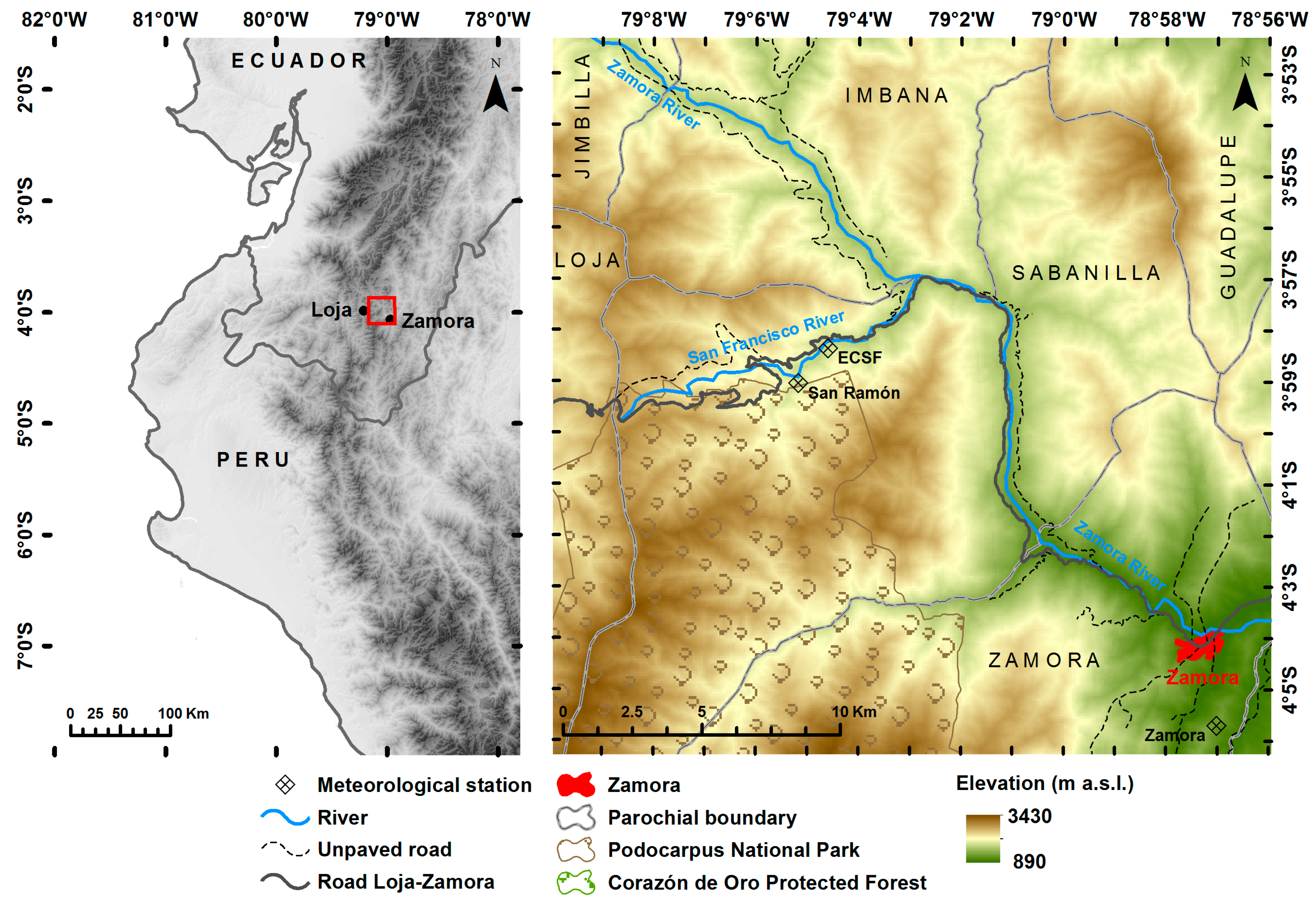 Politically, the area under investigation comprises the rural parishes (parroquias) of Imbana, Sabanilla, and Zamora in the Zamora-Chinchipe province, where most of the inhabitants are Mestizo settlers (~80%, [61]). The northern part of the study area has been mainly colonized by the Saraguros, a Quechua indigenous group from the highlands of Loja province. The main road crossing the area connects Loja (capital of the Loja province) and Zamora (capital of the Zamora-Chinchipe province).