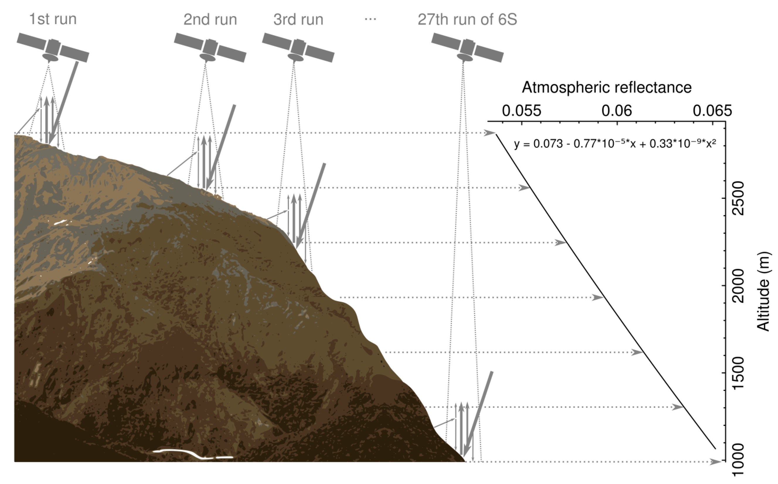 To compensate for the varying atmospheric effects within the study area, we developed a fully automatic module (AtToCor) combining an extended version of the Second Simulation of the Satellite Signal in the Solar Spectrum radiative transfer code (6S code [65]) and a topographic correction module.