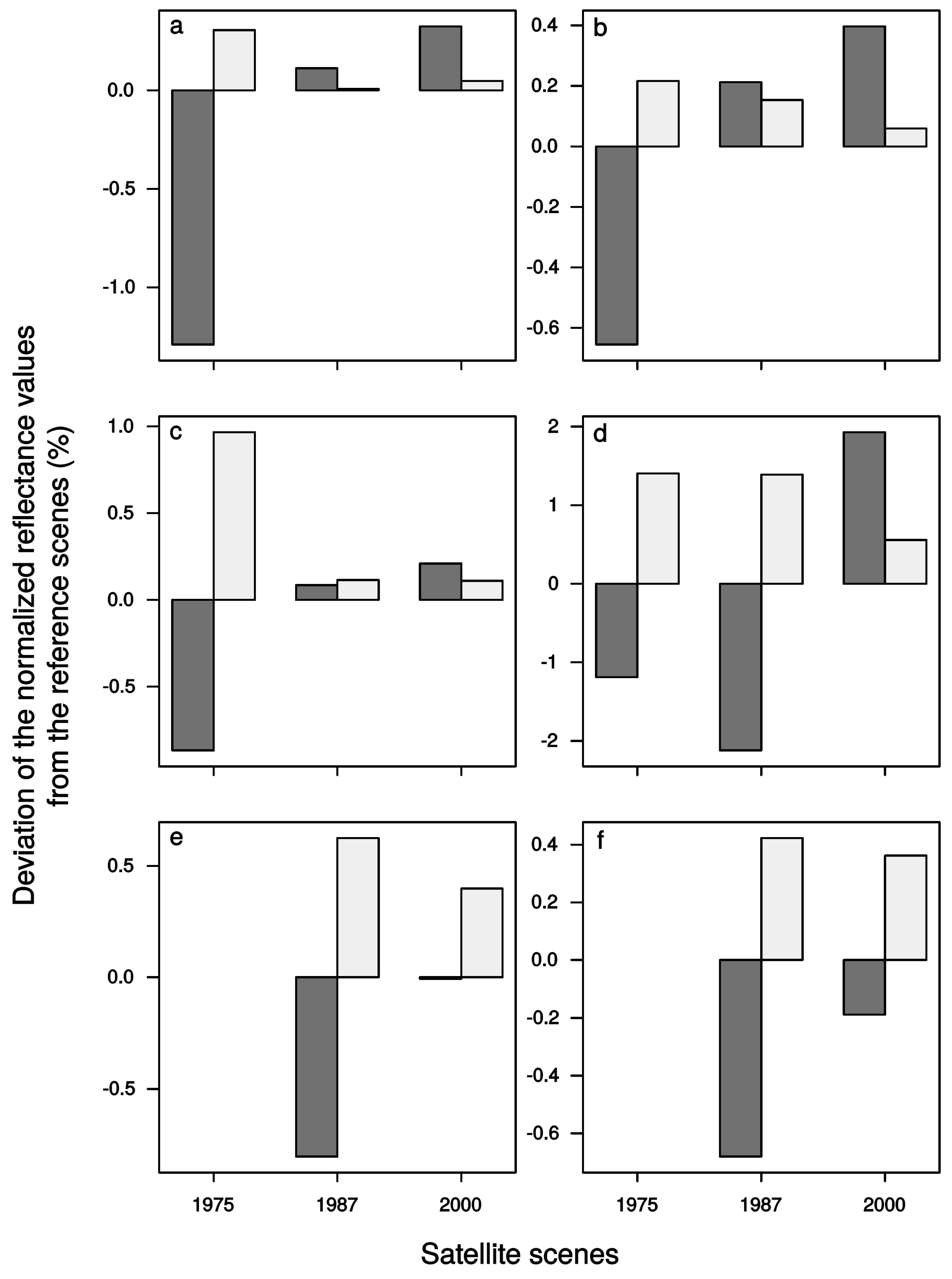 Deviation of the normalized reflectances from the reference scenes (1980 and 2001) for a no-change subset of forest, before (dark bars) and after (bright bars) the intercalibration, in the (a) blue; (b) green; (c) red; (d,e) NIR 1 & 2; and (f) MIR bands of the Landsat satellite images of 1975, 1987, and 2000.