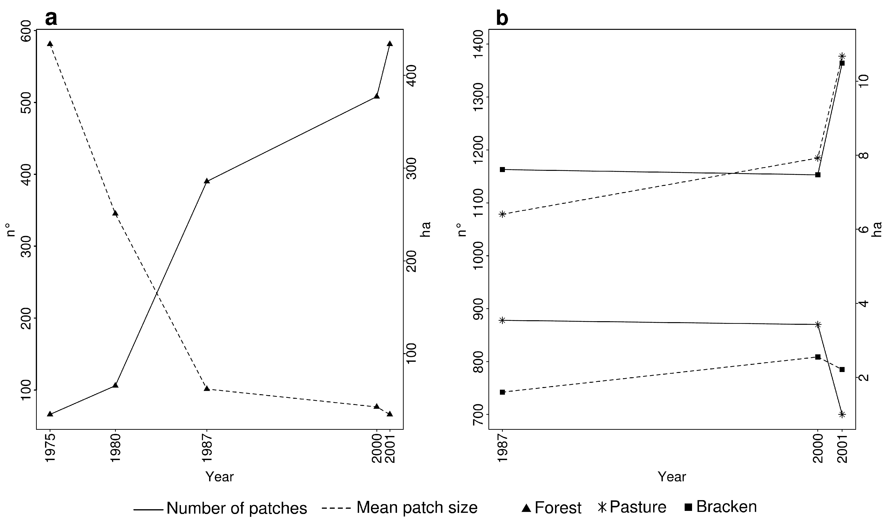 The cultural landscape in the study area is principally composed of a mosaic of forest patches, pastures, and bracken-infested areas (Figure 2), the latter being a less diverse and probably long-lasting system [39,44].