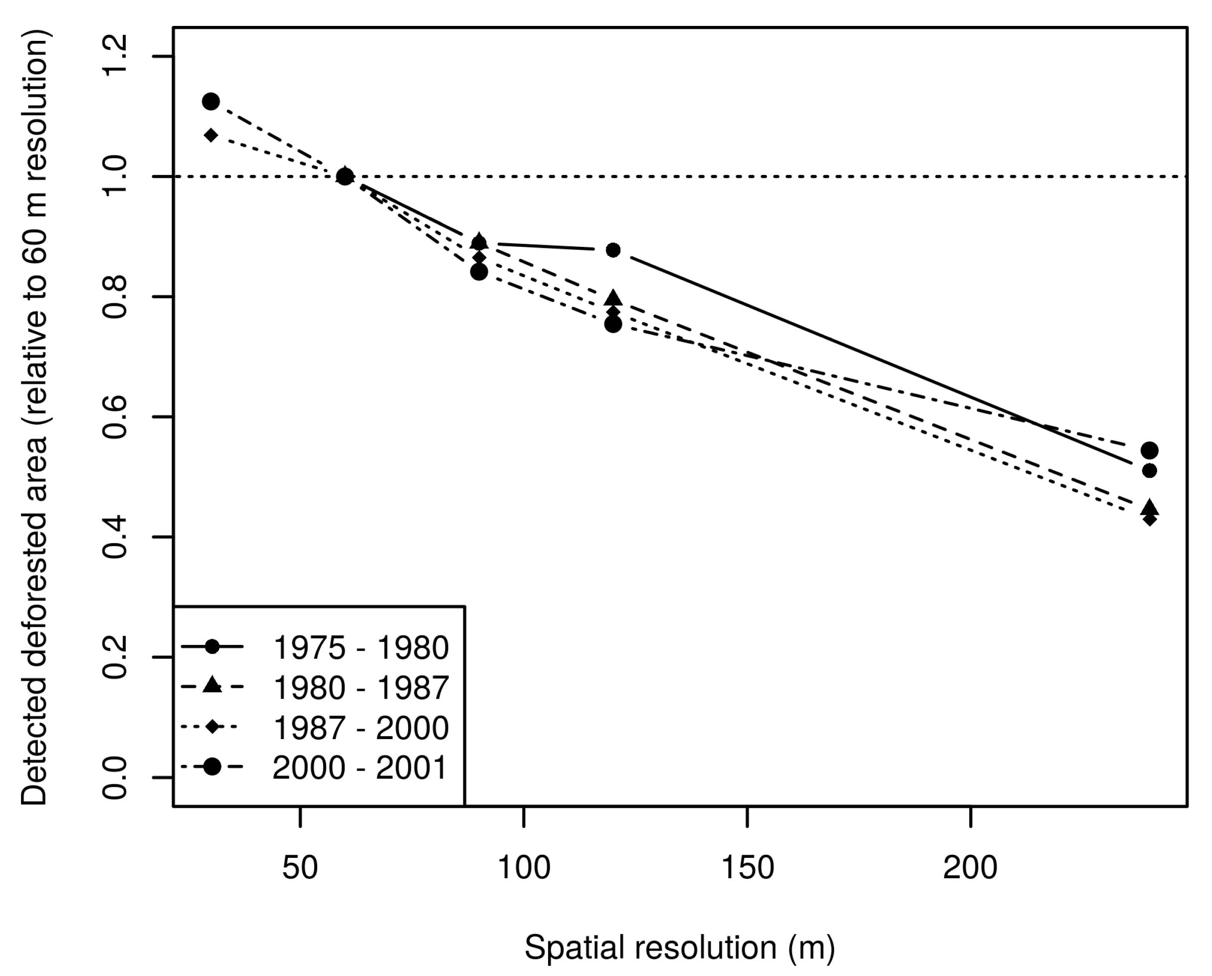 For spatial accuracy of change detection, the satellite images were co-registered to one reference image (2001) using the first-order polynomial function. Root mean square errors of less than half a pixel were achieved for all images.
