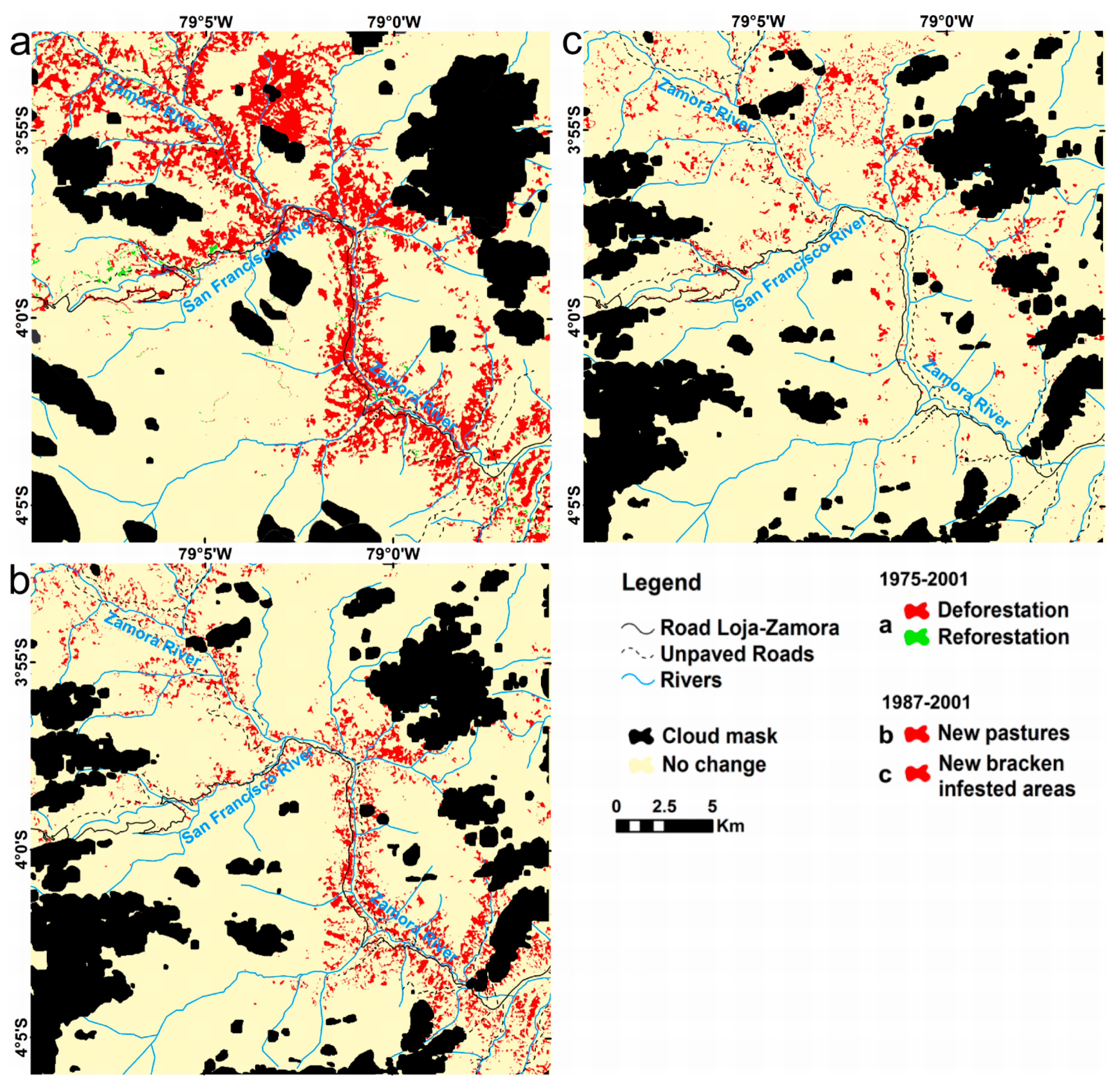 In the megadiverse tropical mountain forest in the Andes of southern Ecuador, a global biodiversity hotspot, the use of fire to clear land for cattle ranching is leading to the invasion of an aggressive weed, the bracken fern, which is threatening diversity and the provisioning of ecosystem services. To find sustainable land use options adapted to the local situation, a profound knowledge of the long-term spatiotemporal patterns of land cover change and its drivers is necessary, but hitherto lacking. The complex topography and the high cloud frequency make the use of remote sensing in this area a challenge. To deal with these conditions, we pursued specific pre-processing steps before classifying five Landsat scenes from 1975 to 2001. Then, we quantified land cover changes and habitat fragmentation, and we investigated landscape changes in relation to key spatial elements (altitude, slope, and distance from roads). Good classification results were obtained with overall accuracies ranging from 94.5% to 98.5% and Kappa statistics between 0.75 and 0.98. Forest was strongly fragmented due to the rapid expansion of the arable frontier and the even more rapid invasion by bracken. Unexpectedly, more bracken-infested areas were converted to pastures than vice versa, a practice that could alleviate pressure on forests if promoted. Road proximity was the most important spatial element determining forest loss, while for bracken the altitudinal range conditioned the degree of invasion in deforested areas. The annual deforestation rate changed notably between periods: ~1.5% from 1975 to 1987, ~0.8% from 1987 to 2000, and finally a very high rate of ~7.5% between 2000 and 2001. We explained these inconstant rates through some specific interrelated local and national political and socioeconomic drivers, namely land use policies, credit and tenure incentives, demography, and in particular, a severe national economic and bank crisis.