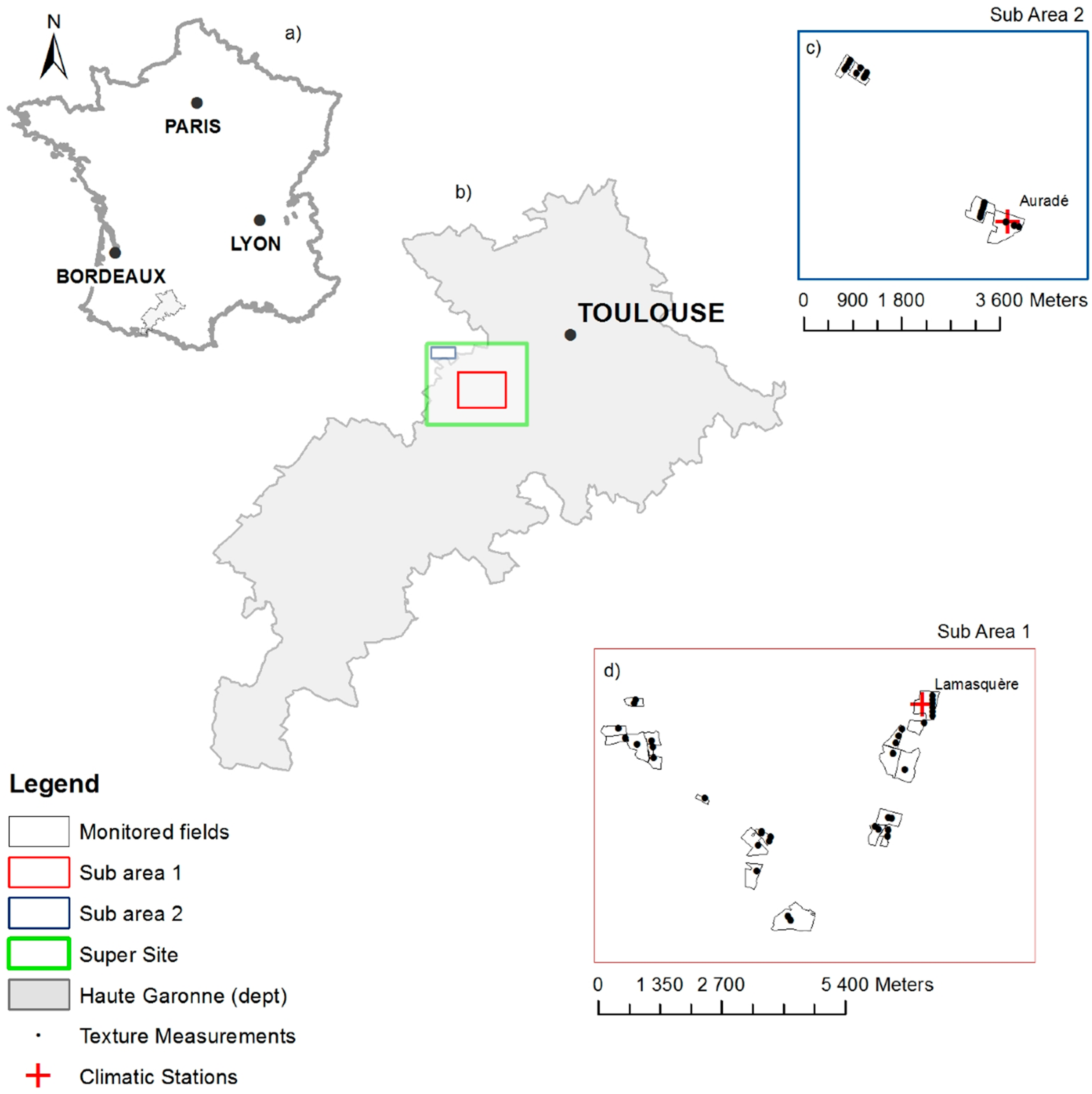 The studied site is located in the southwestern France, in the department of Haute Garonne (a), including two sub-areas named “Lamasquère” (red empty rectangle) and “Auradé” (blue empty rectangle) (b–d). Texture measurements are shown as black dots, within the agricultural plots (c and d).
