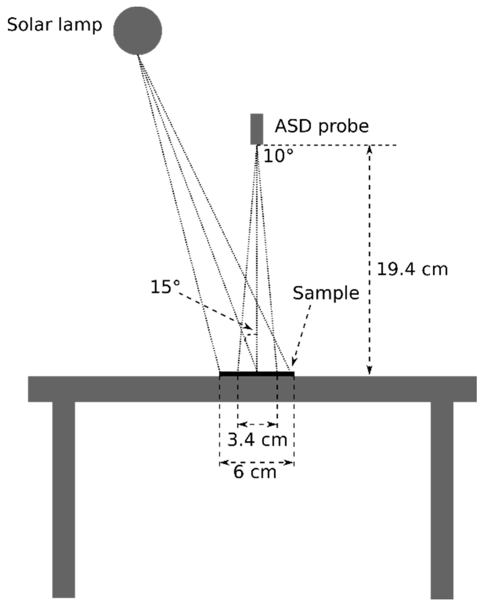 The laboratory measurements were performed according to the experimental protocol defined in [33]. The sample was uniformly illuminated by a solar halogen lamp with an illumination zenith angle of 15°. The ASD was used with a field of view (FOV) of 10°, with a nadir observation, and placed at around 20 cm from the sample (see Figure 3). The observed surface had a diameter of 6 cm. The spectral reflectance was measured for each sample at different SMC (see Section 2.2.1) and then the spectra were smoothed with a Savitzky-Golay filter for reducing noisy signal [56].