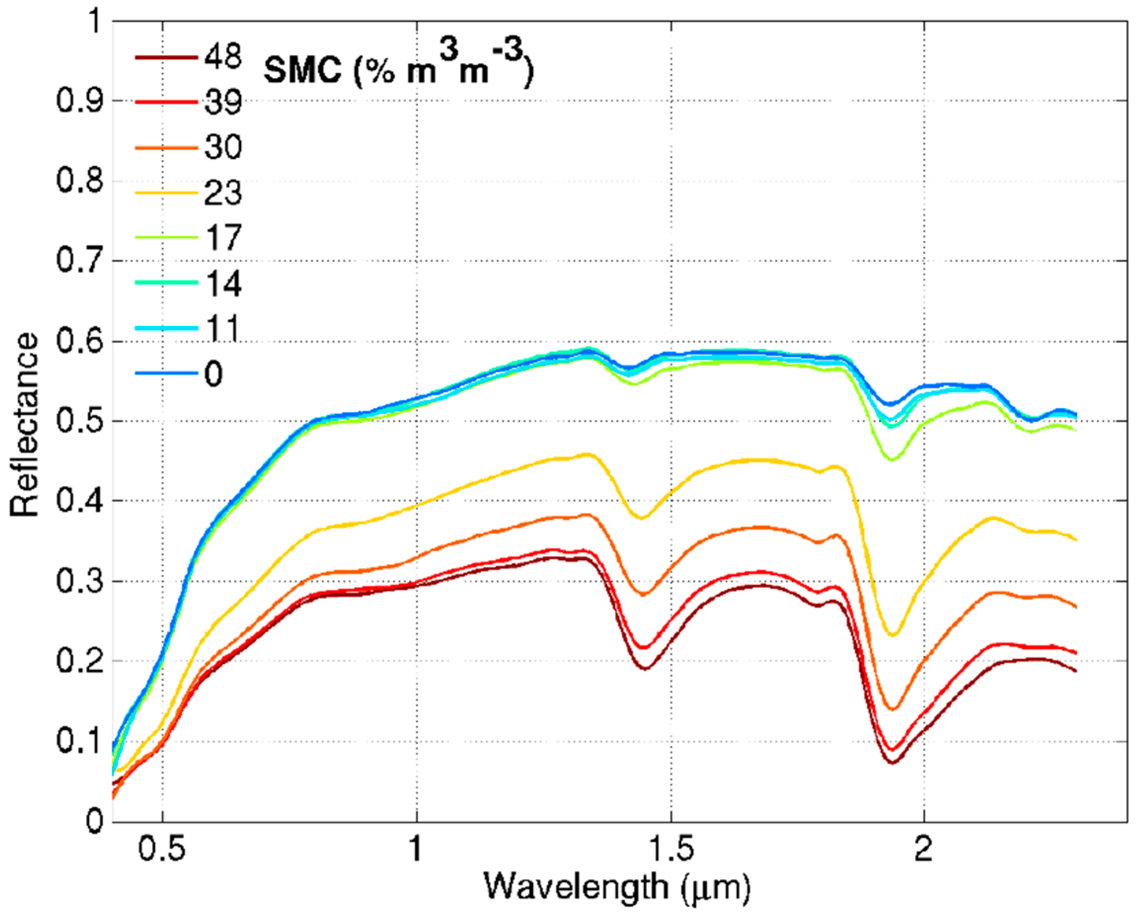 Evolution of the spectral signatures depending on the volumetric soil moisture content ranging between 0 and 48% m3∙m −3. The soil sample is composed with 30% of clay, 16% of sand and 54% of silt.