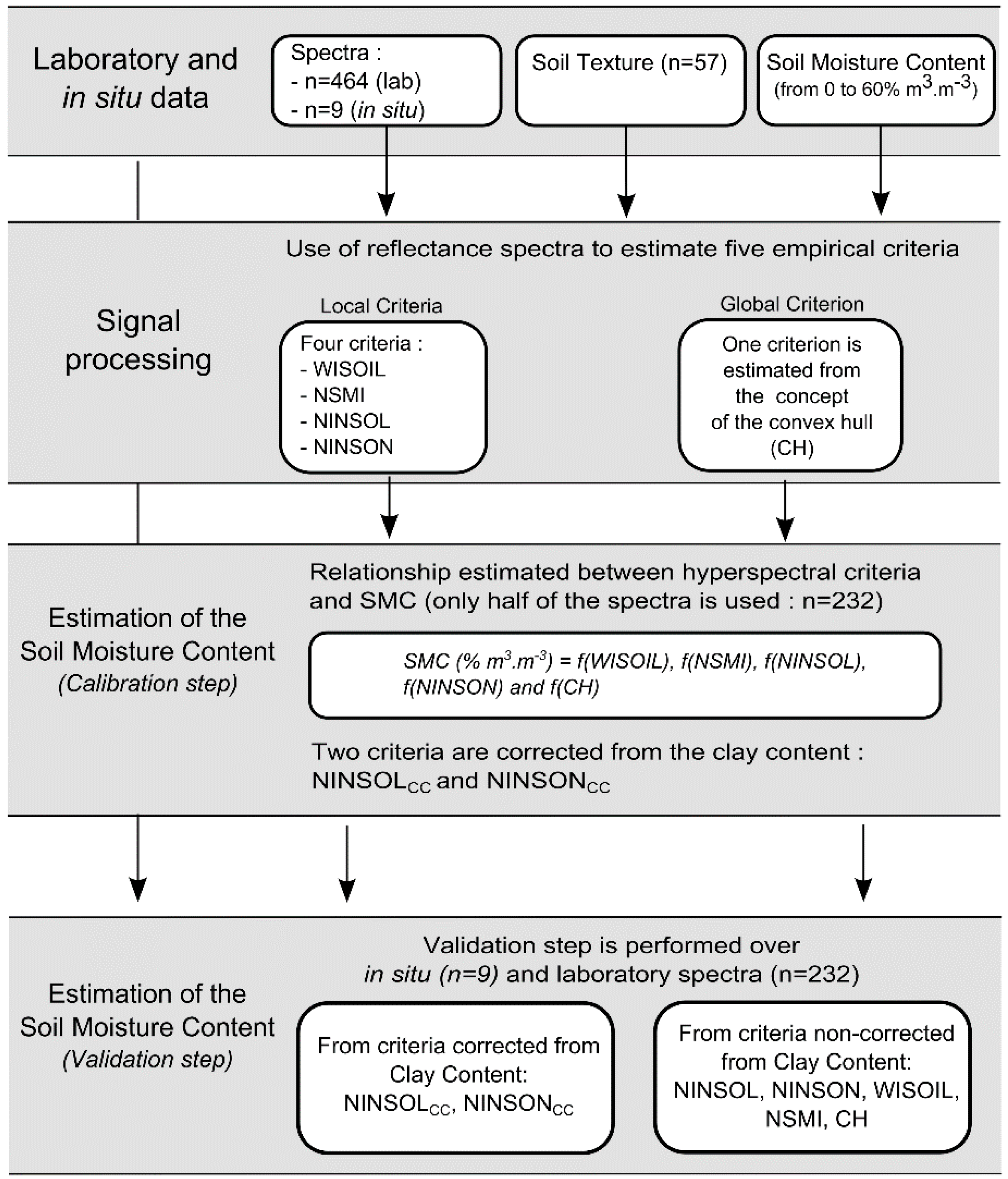 The flowchart, presented in Figure 5, summarizes the different steps used to estimate the SMC from spectral information. The spectral signatures, acquired in laboratory or in-situ, were used to process four local indices and one global criterion, as detailed in the following Sections (3.1 and 3.2). The SMC estimation was achieved using one calibration and one validation step. The calibration one was used to initialize the parameters of the SMC retrieval models. The calibration database was composed of 50% of the 464 spectral signatures in the reference dataset and their related SMC data. The validation process was performed using both the other 50% of the reference dataset, and 9 in-situ data (spectra and associated SMC). The division of the entire database in two datasets ensured an equal distribution of the samples covering the same SMC range in both cases. In the validation step, we also evaluated the interest of using the CC information to improve the SMC estimation. Results were statistically evaluated using the R2, the bias and the RMSE, the last two defined by Equations (8) and (9).