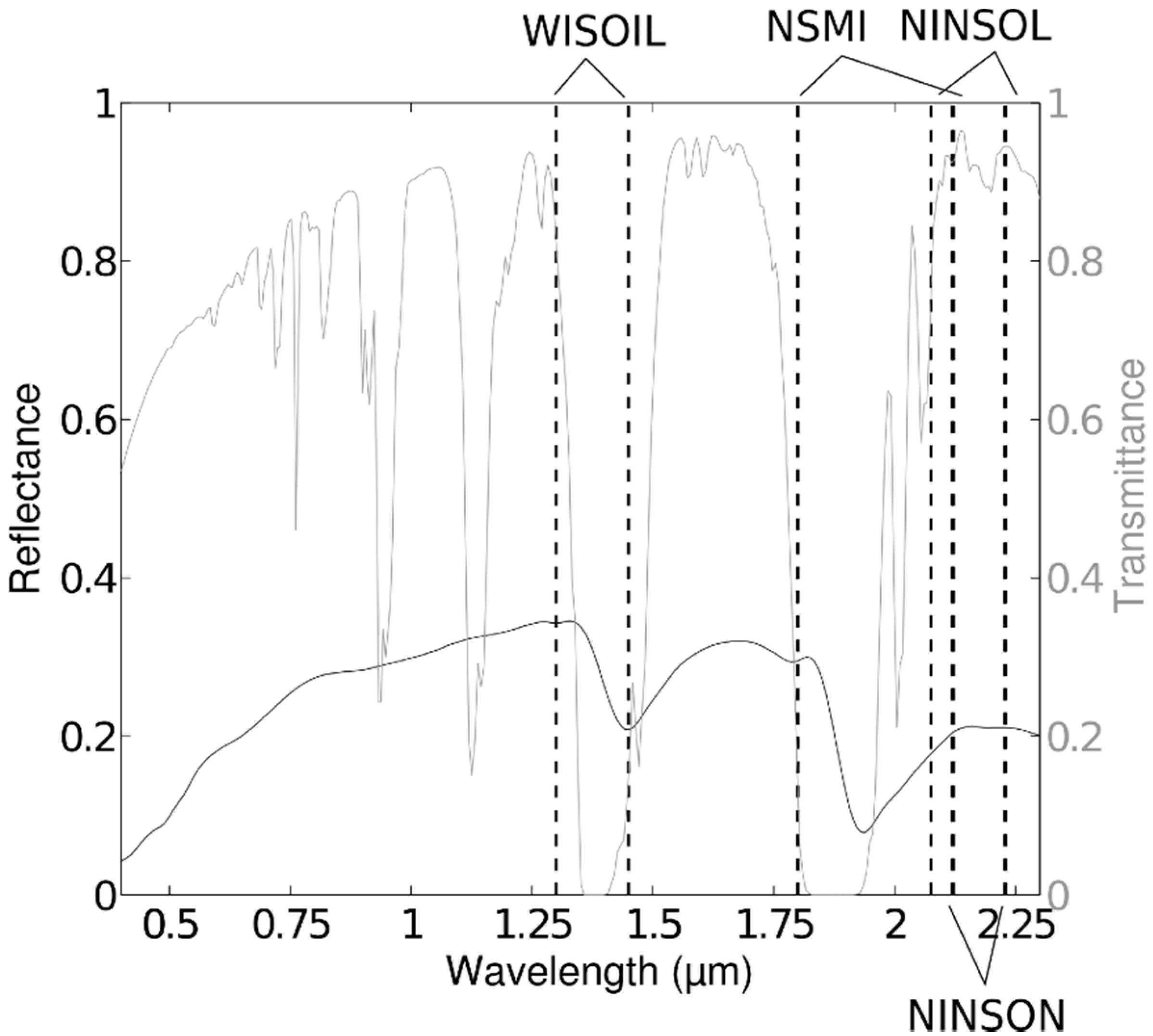 Example of a bare soil sample reflectance spectrum, superimposed with the index bands located by vertical dotted lines and with the atmospheric transmittance (in gray).