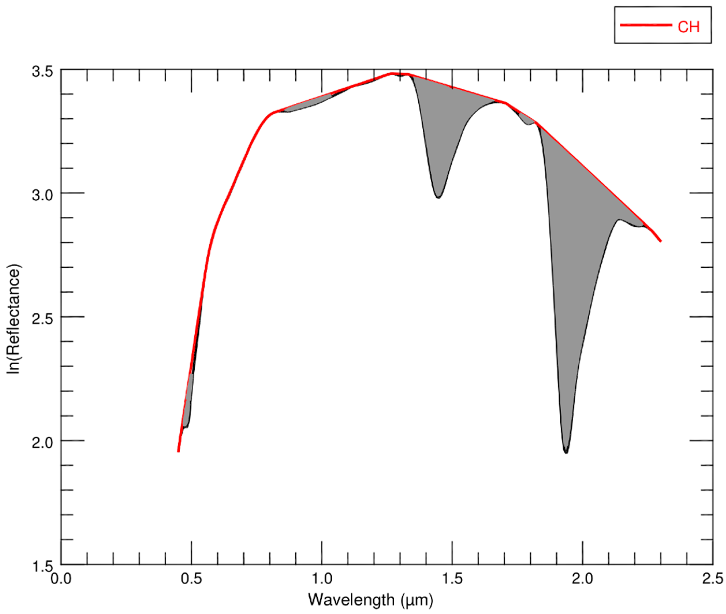Example of a bare soil sample natural logarithm reflectance (black line) with its convex hull (red line). The area calculated between the spectrum curve and the CH is displayed in gray.
