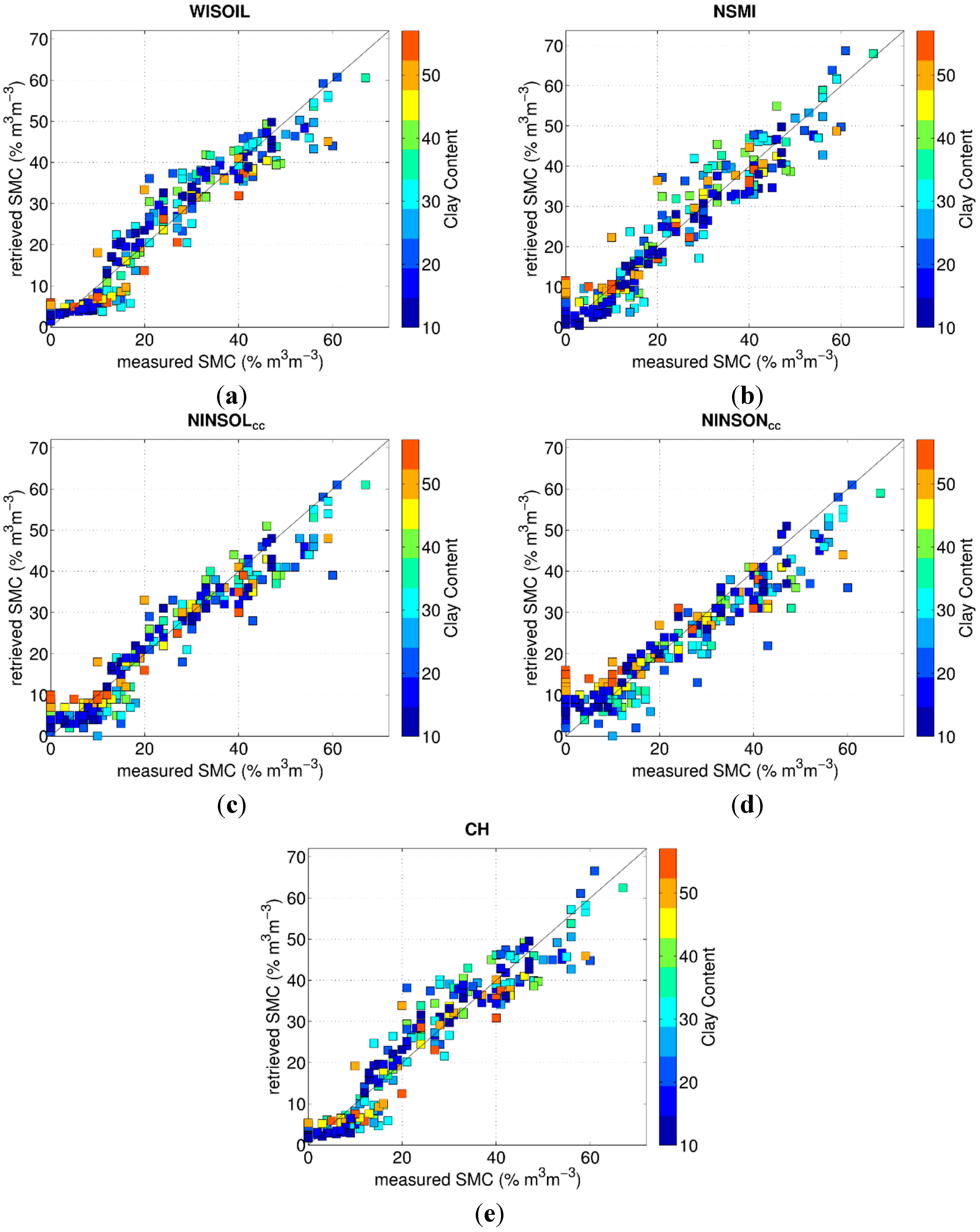 Comparison between measured and estimated SMC. Four criteria are considered: (a) WISOIL; (b) NSMI; (c) NINSOLCC; (d) NINSONCC and (e) CH. The color bar indicates the clay content (%).