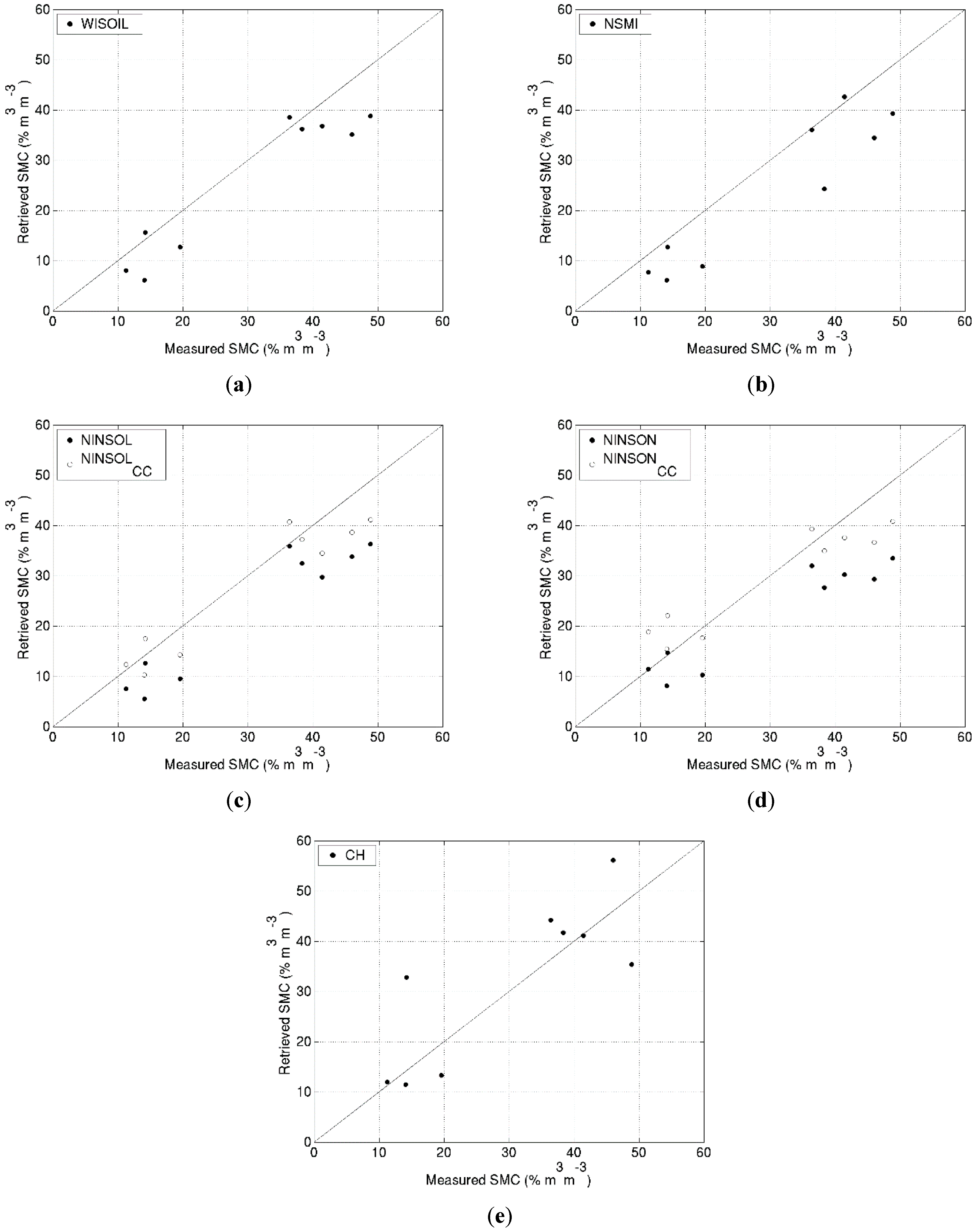 Finally, we incorporated the relations 12 and 13 in the original NINSOL and NINSON models (shown in Figure 8c,d). The new SMC retrieval models, with the CC correction (SMCCC) are, respectively, named NINSOLCC and NINSONCC. They are defined, respectively, in Equations (14) and (15), and they allowed the estimation of SMC with a R2 of 0.92 and 0.89, respectively .This meant an improvement of the data fit of 7% for the NINSOL and of 17% for the NINSON, after the CC correction.