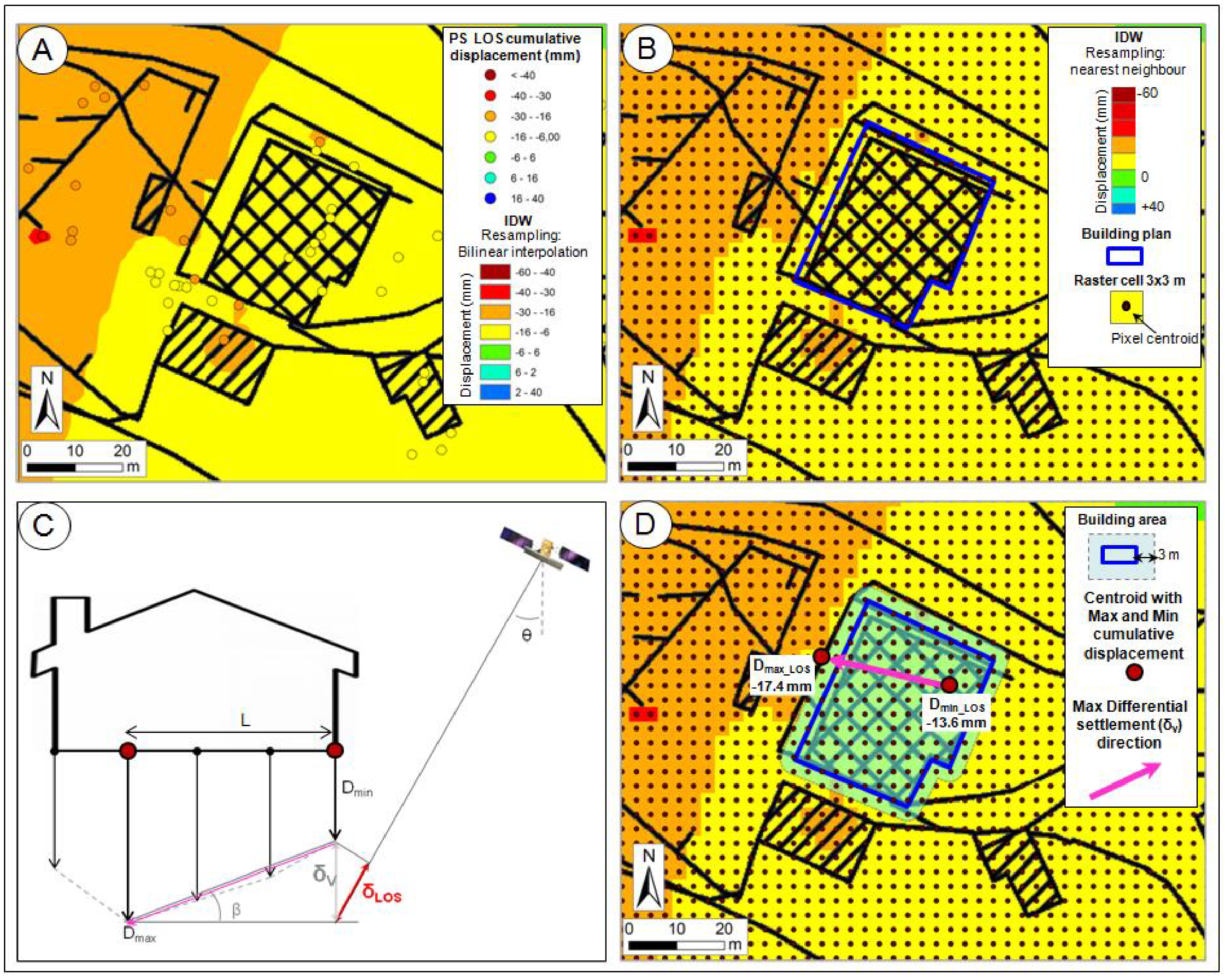 Step by step procedure for building damage characterization and estimation: (A) PSI data and derived IDW surface displayed as bilinear interpolation layered on building boundaries; (B) IDW surface displayed as a nearest-neighbor discrete raster, with pixel centroids obtained for each raster cell; (C) schematic representation of differential settlement parameters used within the analysis; (D) computation of differential settlement direction within an appropriate buffer around the building.