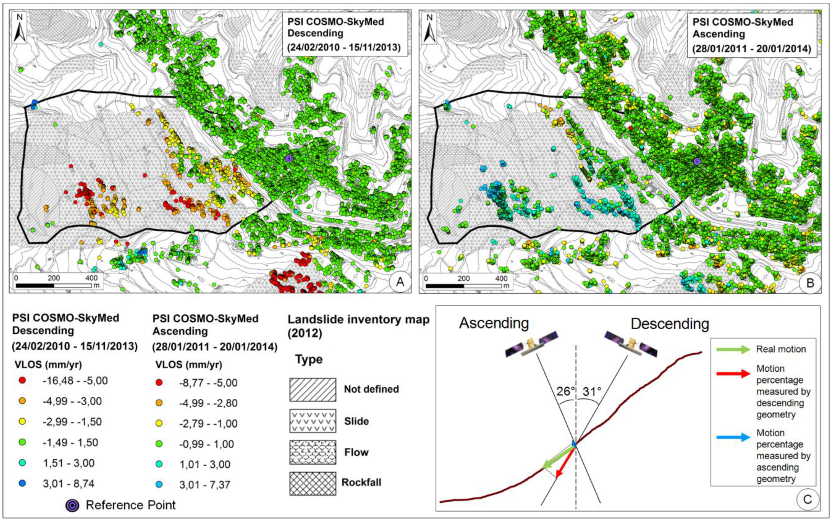 In particular, advanced multi-temporal interferometric techniques that generate radar benchmarks using a multi-interferogram analysis of SAR (synthetic aperture radar) images, i.e., persistent scatterer interferometry [3], have been successfully used in the last few years for investigating active geological processes, such as landslides and subsidence [4,5,6,7,8]. Persistent Scatterer Interferometry (PSI) relies on temporally stable and highly reflective ground elements, called PS (Persistent Scatterer), in correspondence with which yearly terrain motion rates can be measured with high precision. These scatterers are typically man-made structures (i.e., buildings, pylons, roadways, etc.) or natural elements (i.e., rocks) with stable and strong backscattering and coherence characteristics [9]. As a consequence, PSI data are particularly effective for urbanized areas where many radar benchmarks can be retrieved [10]. Just on these populated and built-up areas, potential damages and losses caused by ground instability are stronger due to the higher value of the exposed elements at risk [11].