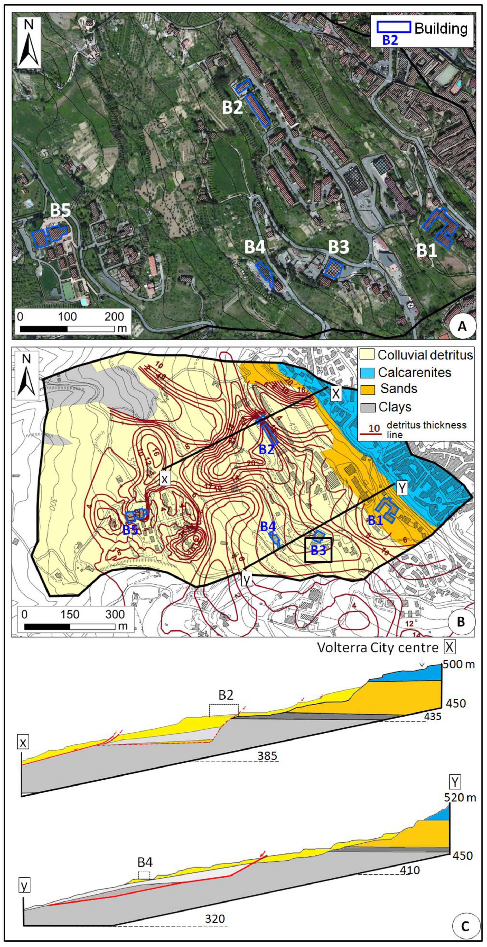 Both buildings are located on an area affected by shallow translational slides, according to the available landslide inventory map. Moreover, the buildings are sited on the above-mentioned scarp, thus standing at the stratigraphic contact between geotechnically different lithotypes, i.e., the clayey bedrock and the upper colluvial sediments.