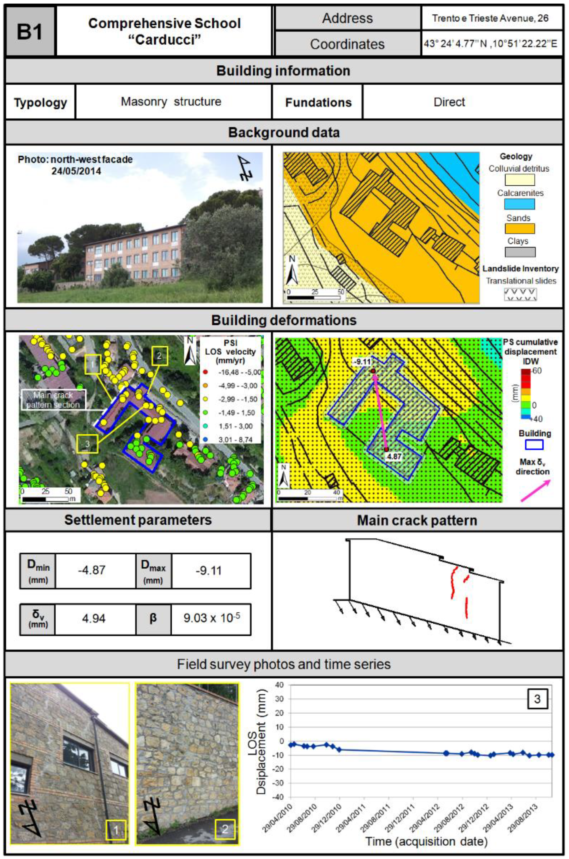 Analysis results of building B1: building information, background data, building deformations, settlement parameters, main crack pattern, some photos of the field survey and a PS time series (the gap during year 2011 is due to missing acquisitions).
