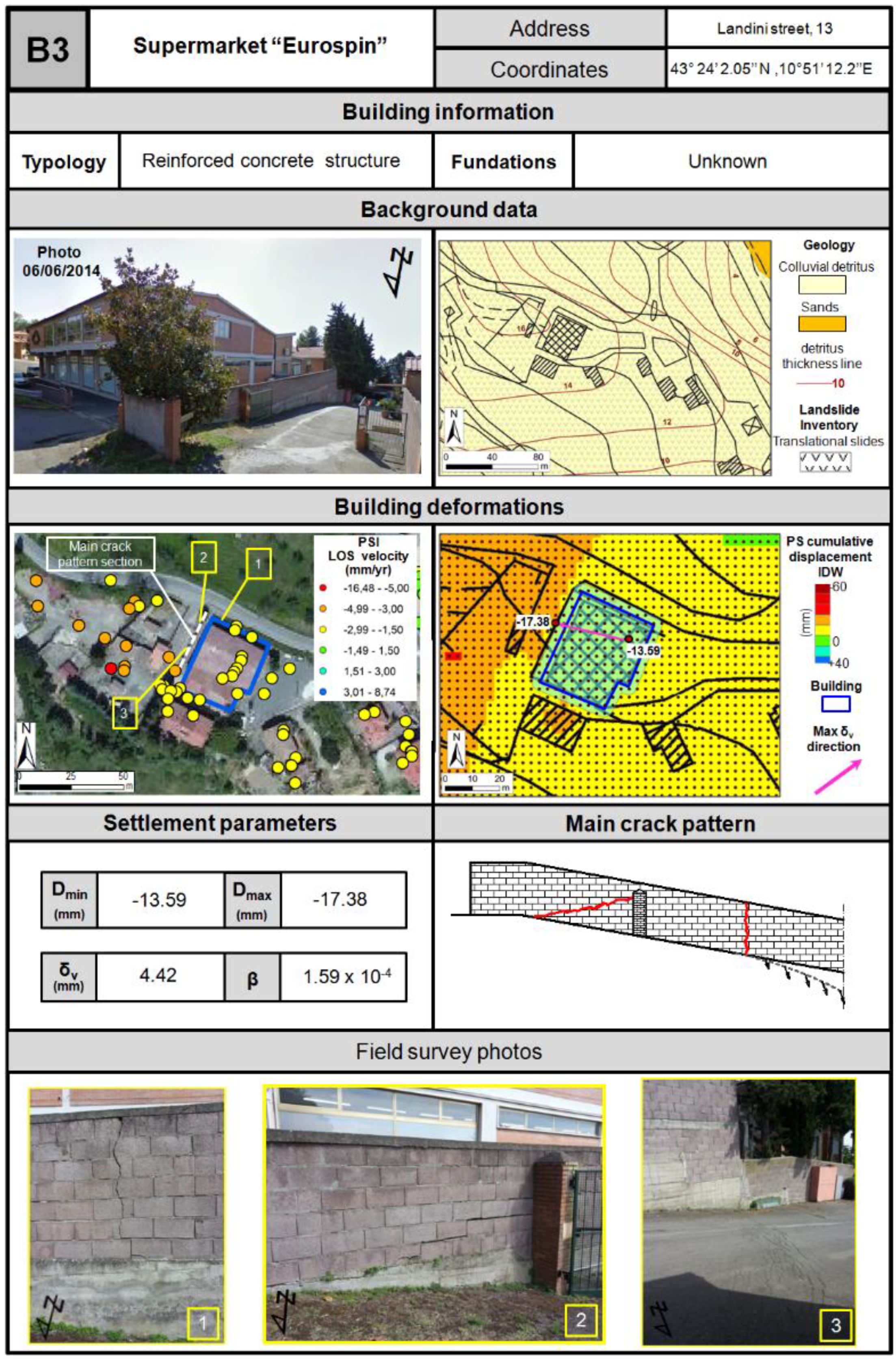 As a result, PSI data, differential settlement parameters and field checks confirm that the whole area is unstable and landsliding, and the higher movements detected towards W-NW of the building B3 within the landslide body could be determined by the higher thickness of the colluvial deposits, which increases the creeping and slope instability.
