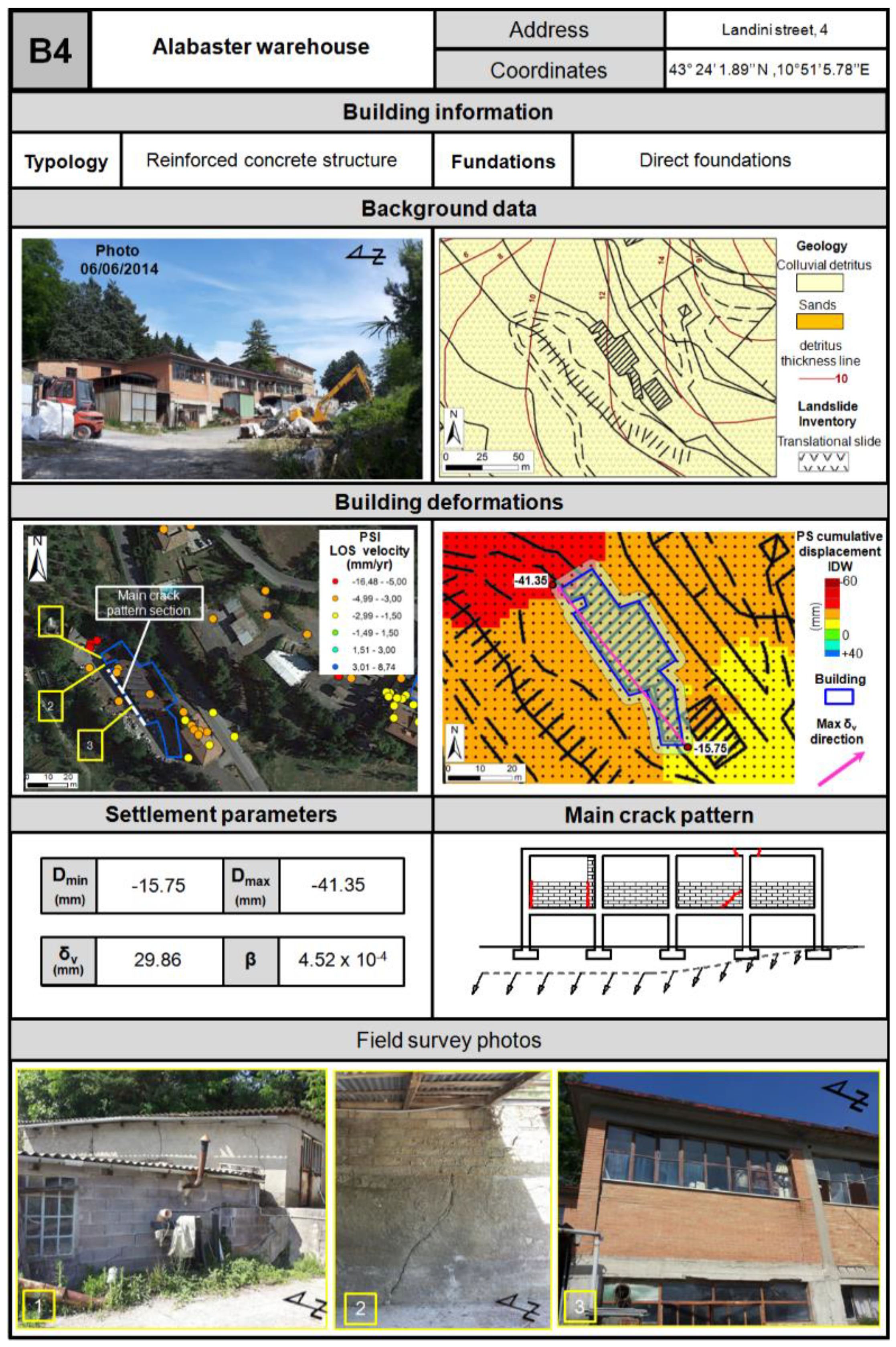 Building B3 and building B4, respectively the supermarket and the alabaster warehouse, are located within a landslide area. This downslope translational ground movement is confirmed by the high mean PSI velocities that reach up to rates of about 6–8 mm/year. In particular, building B4 shows the highest δv (29.86 mm) and high β value (4.52 × 10−4) due to the significant spatial trend of the movement. On the other hand, building B3 shows the lowest δv value (4.42 mm), since the highest motion rates are located westwards of the “building area”. The cross-comparison of PSI data, δv and β values and directions and in situ observations revealed that the crack patterns surveyed on both buildings are compatible with ground motion rates due to the slow-moving landslide phenomenon.
