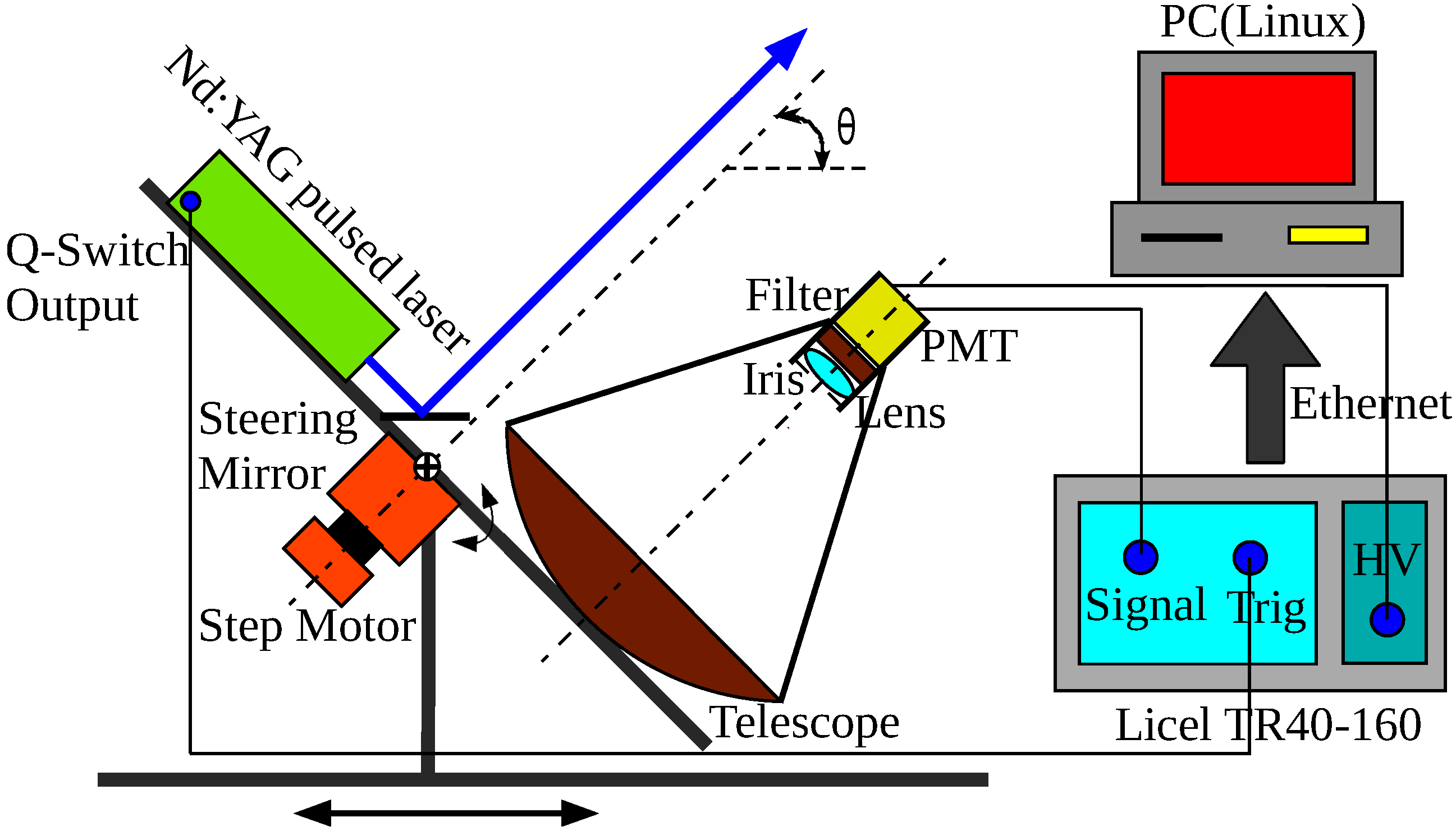 A schematic diagram of the ultraviolet scanning elastic backscatter LiDAR system is shown in Figure 1. A high power compact Q-switched Nd:YAG pulsed laser is employed as the transmitter, which produces a laser pulse with an energy of 95 mJ per pulse at 355 nm after triple frequency. A parabolic mirror with a diameter of 800 mm and a focal length of 410 mm is utilized as the receiver. Both the transmitter and receiver are mounted on a common frame to make the LiDAR system steerable, but only with the elevation angle changing from −5° to 90°. The offset of the laser beam direction has been calibrated against a self-leveling laser to improve the performance of the LiDAR system [26]. A photomultiplier tube (PMT) is positioned near the focus of the parabolic mirror to detect the LiDAR return signals. In order to suppress the background components in the total backscattering light, an iris, a collimating lens and an interference filter are put consequently in front of the PMT. With the current filter, background noise in daytime operation is still prohibitive, thus all of the measurements are performed during the night. The output of the PMT is amplified and digitized by a Licel TR40-160 transient recorder, which is connected to a Linux-based data acquisition computer via an Ethernet link. The data acquisition software based on C++ code and the ROOT package features graphical interfaces for the full digitizer, laser and telescope control and physics analysis. The detailed specifications of the scanning LiDAR are listed in Table 1.