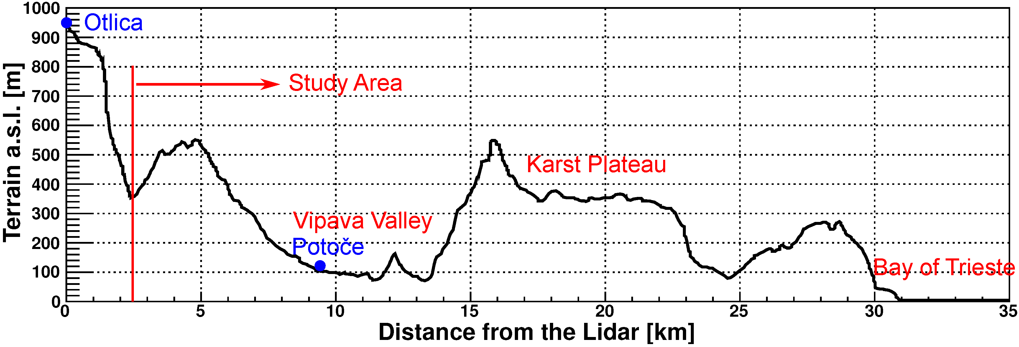Terrain configuration along the LiDAR scanning line. The study area is marked by the red arrow, including the Vipava Valley, the Karst Plateau and the Bay of Trieste. In order to see the variation of the terrain configuration in the study area, the vertical axis is scaled in meters, while the horizontal axis of the distance from the LiDAR is scaled in kilometers.