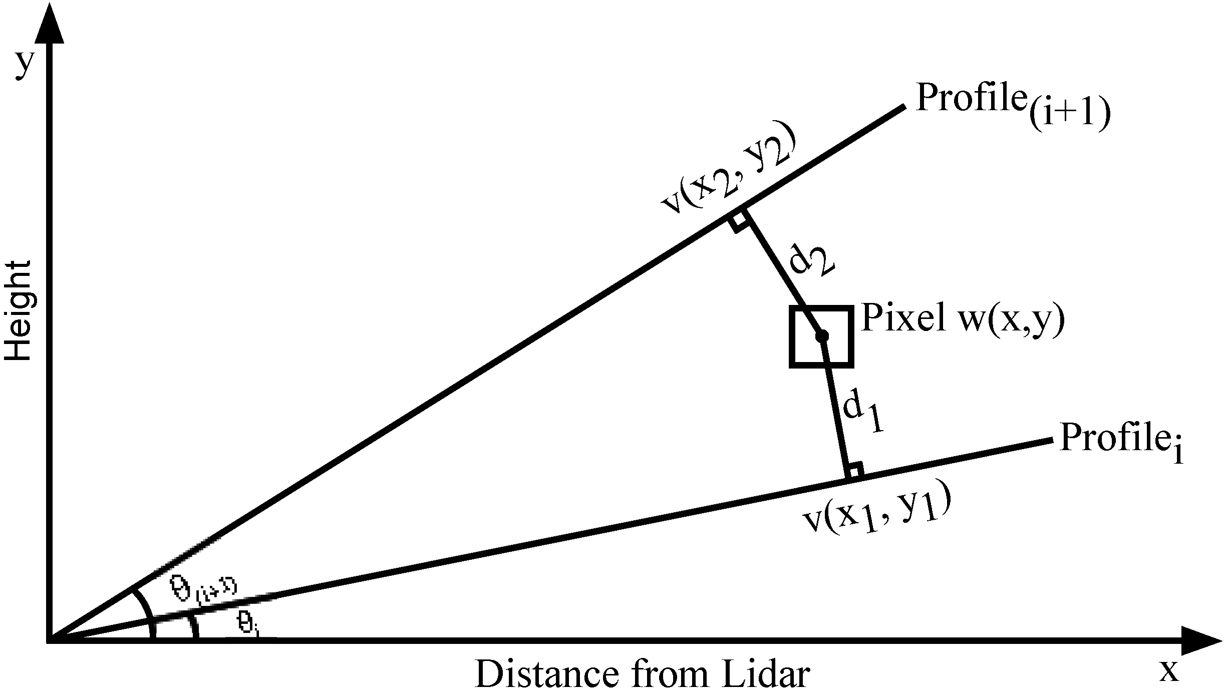 Construction of Cartesian 2D range-height-indicator (RHI) diagrams. A weighted logarithm range squared corrected signal (RSCS) value is calculated by a barycentric interpolation scheme between the LiDAR return signal profiles from successive scanning angles. Each pixel of the diagram represents atmospheric information at that position.