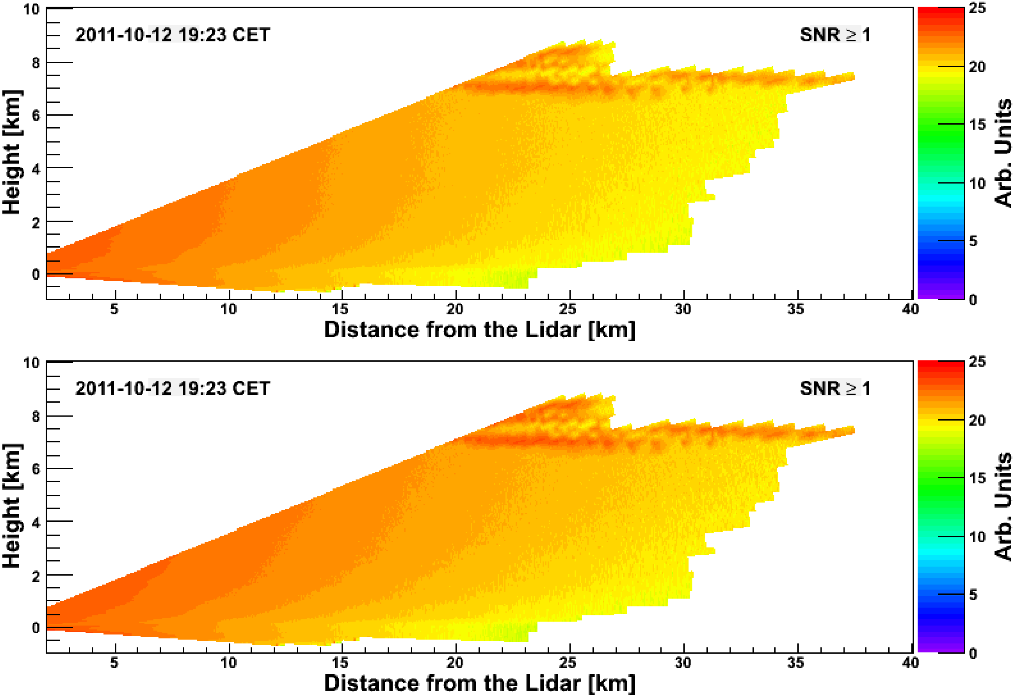 Effect of Rayleigh correction (top, before; bottom, after) on a 2D RHI diagram to show the atmospheric conditions. The scan example was taken from the LiDAR-radiosonde measurements at 19:23 Central European Time (CET) on 12 October 2011. The height is given relative to the altitude of the LiDAR site.